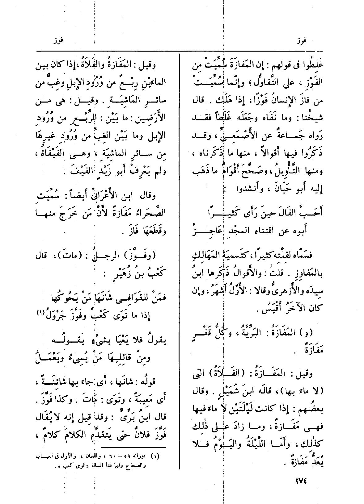 فسَمَّاه لقِلَّته كَثيراً، كتَسْمِيَة المَهالِكِ} بالمَفاوُزِ. قلتُ: والأَقوالُ ذَكرَها ابْن سِيده والأَزْهَرِيُّ وَقَالا: الأَوَّل أَشهَر، وَإِن كَانَ الآخَرُ أَقْيَسُ. المَفازَةُ: البَرِّيَّةُ، وكُلُّ قَفْرٍ مَفازَةٌ. وَقيل: المَفازَةُ: الفَلاةُ الَّتِي لَا ماءَ بهَا، قَالَه ابْن شُمَيْلِ. وَقَالَ بَعضهم: إِذا كَانَت لَيْلَتَيْنِ لَا مَاء فِيهَا فَهِيَ مَفازَةٌ، وَمَا زَاد على ذَلِك كَذَلِك، وأَمّا الليلةُ واليومُ فَلَا يُعَدُّ مَفازَةً. وَقيل: {المَفازَةُ والفَلاةُ، إِذا كَانَ بَين الماءينِ رِبْعٌ من ورودِ الْإِبِل وغِبٌّ من سَائِر الْمَاشِيَة. وَقيل: هِيَ من الأَرَضين: مَا بَين الرِّبْعِ من وُرودِ الْإِبِل وَمَا بَين الغِبِّ من وُرُود غَيرهَا من سَائِر الْمَاشِيَة، وَهِي الفَيْفَاءُ، وَلم يعرف أَبو زيدٍ الفَيْفَ. وَقَالَ ابْن الأَعرابيّ أَيضاً: سُمِّيَتِ الصَّحراءُ} مَفازَةً لأَنَّ من خرجَ مِنْهَا وقطَعها فَازَ.