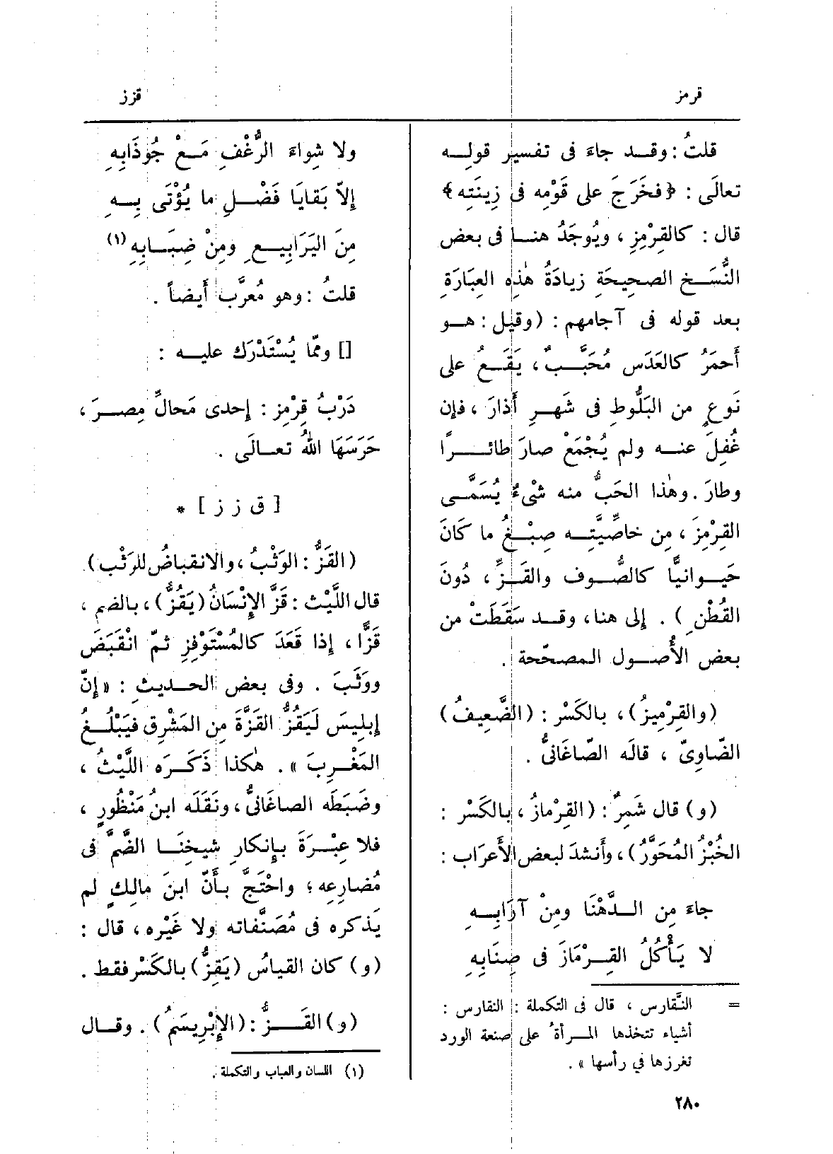 قلتُ: وَقد جَاءَ فِي تَفْسِير قولِه تَعَالَى: فخَرَجَ على قومِه فِي زينَتِه قَالَ: كالقِرْمِزِ، ويوجَدُ هُنَا فِي بعض النُّسَخ الصحيحةِ زيادةُ هَذِه العبارَةِ بعد قَوْله فِي آجامهم: وَقيل: هُوَ أَحْمَرُ كالعَدَس مُحَبَّبٌ، يَقع على نوعٍ من البلُّوطِ فِي شهرِ آذارَ، فَإِن غُفِلَ عَنهُ وَلم يُجْمَع صارَ طائراً وطارَ.