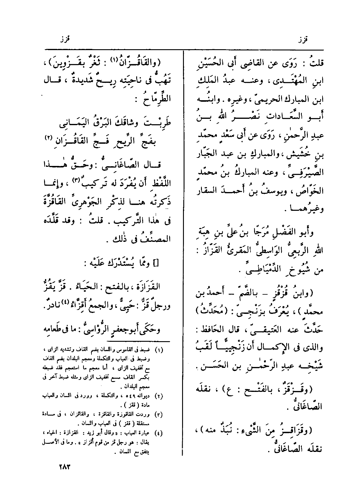 قلتُ: روى عَن القَاضِي أبي الْحُسَيْن بنِ المُهتَدي، وَعنهُ عبدُ الملِكِ بن الْمُبَارك الحريميّ، وغيرِه، وابنُه أَبُو السَّعاداتِ نَصْرُ الله بنُ عبدِ الرَّحْمَن، روى عَن أبي سَعْدٍ مُحَمَّد بن خُشَيْش، والمُبارَكِ بن عبد الجبّار الصَّيْرَفيّ، وَعنهُ المُبارَك بن مُحَمَّد الخَوَّاص، ويوسفُ بنُ أحمدَ السقار وغيرُهما. وَأَبُو الفَضلِ مُرَجّا بنُ عليّ بنِ هبةِ الله الرَّبعيُّ الواسِطِيُّ المَقرئُ {القَزّاز: من شُيُوخ الدِّمْياطيّ. وابنُ} قُزْقُزٍ بالضمّ أحمدُ بن محمدٍ، يُعرَفُ بزَنْجِيّ: مُحدِّث حدَّثَ عَنهُ العَتيقيّ، قَالَ الْحَافِظ: وَالَّذِي فِي الْإِكْمَال أَن زَنْجِيّاً لقَبُ شَيْخِه عبدِ الرحمنِ بن الْحسن. {وقَزْقَزٌ، بالفَتْح: ع، نَقله الصَّاغانِيّ.} وقَزاقِزُ منَ الشيءِ: نُبَذٌ مِنْهُ، نَقله الصَّاغانِيّ. والقاقُزّان: ثغرٌ بقَزْوين، تهُبُّ فِي ناحيتِه ريحٌ شَدِيدَة، قَالَ الطِّرْماح: