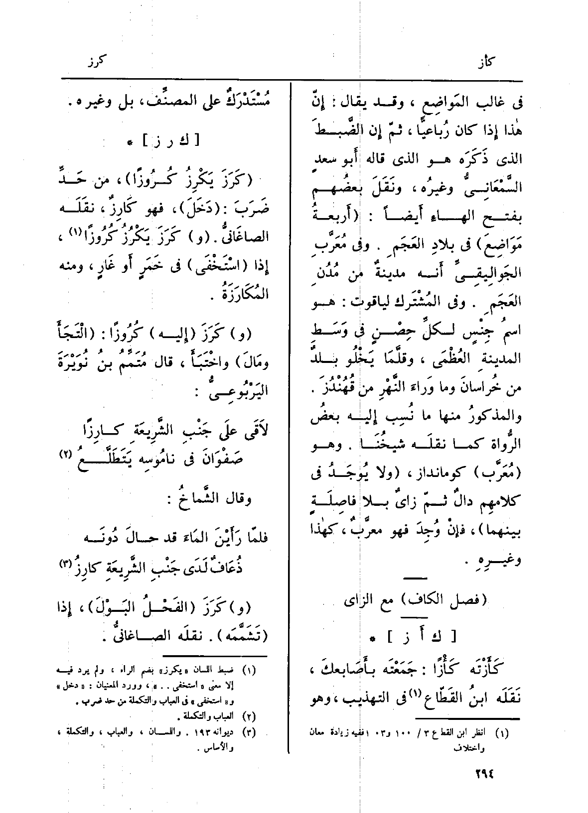 كَرَزَ يَكْرِزُ كُروزاً، من حدِّ ضَرَبَ: دَخَلَ، فَهُوَ كارِزٌ، نَقله الصَّاغانِيّ. كَرَزَ يَكْرُزُ كُروزاً، إِذا استَخفى فِي خَمَرٍ أَو غارٍ، وَمِنْه المُكارَزَة. كَرَزَ إِلَيْهِ كُروزاً: التجَأَ ومالَ واختبَأَ، قَالَ مُتَمِّمُ بنُ نُوَيْرَةَ اليَرْبوعيّ: