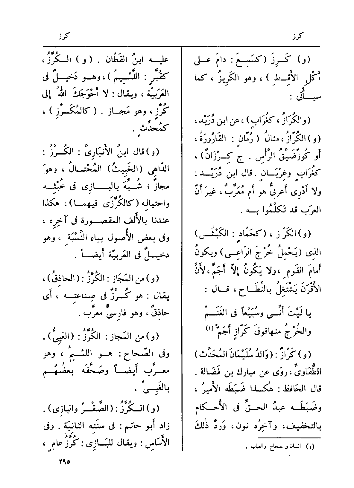 الكُرَّز كقُبَّرٍ: اللَّئِيم، وَهُوَ دَخيلٌ فِي العربيَّة، وَيُقَال: لَا أَحْوَجَكَ اللهُ إِلَى كُرَّزٍ، وَهُوَ مَجاز.