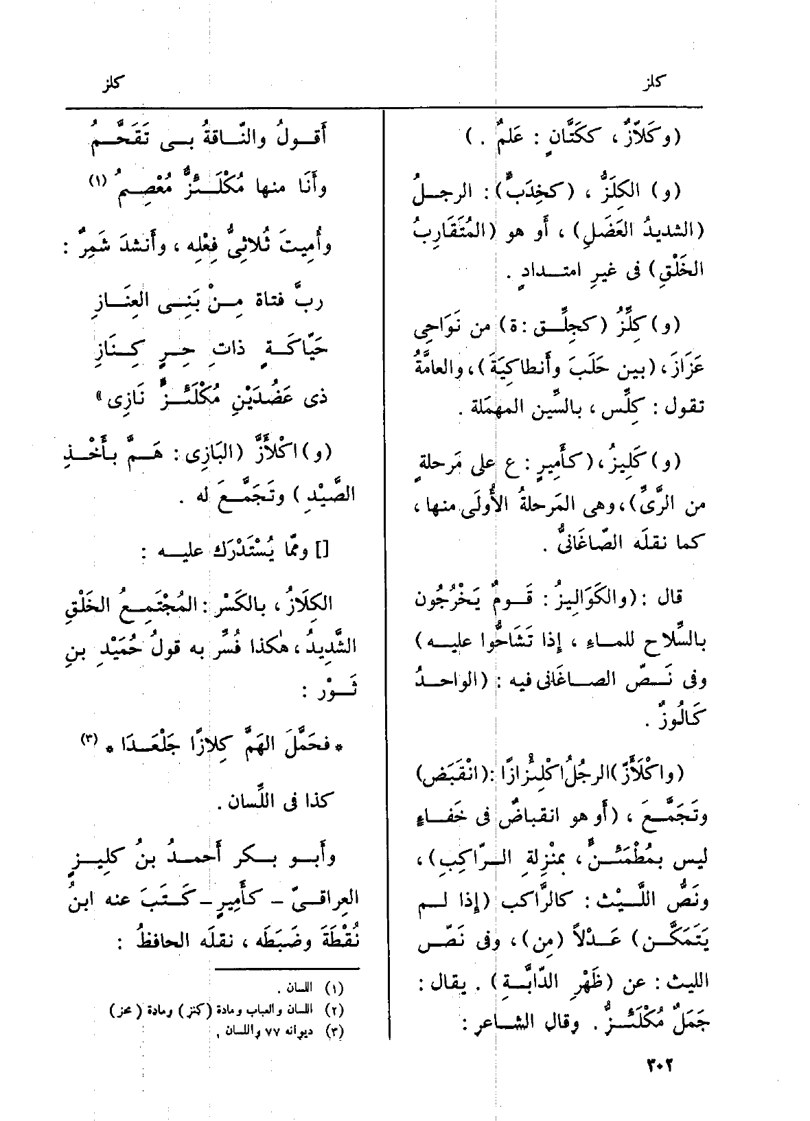 ذِي عَضُدَيْنِ مُكْلَئِزٍّ نازي اكْلأَزَّ الْبَازِي: هَمَّ بأخذِ الصيدِ وتجَمَّعَ لَهُ. ومِمّا يُسْتَدْرَك عَلَيْهِ: الكِلاز، بِالْكَسْرِ: المُجتَمِعُ الخَلْقِ الشديدُ، هَكَذَا فُسِّر بِهِ قَوْلُ حُمَيْدِ بنِ ثَوْر: فحَمَّلَ الهَمَّ كِلازاً جَلْعَدا كَذَا فِي اللِّسان. وَأَبُو بكر أحمدُ بنُ كليزٍ العِراقيّ كأَمير كَتَبَ عَنهُ ابنُ نُقطَةَ وضبطَه، نَقله الْحَافِظ.