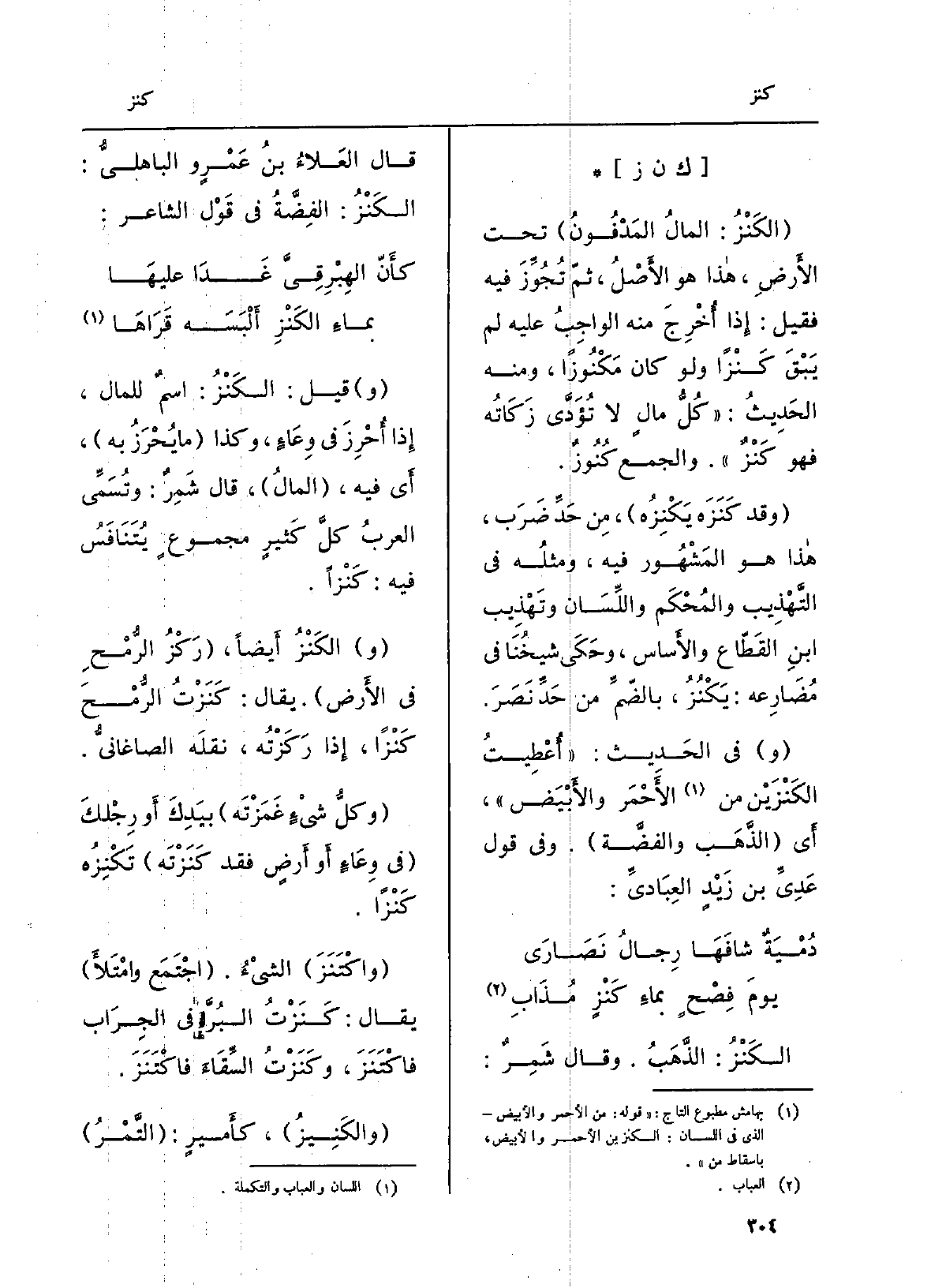 الكَنْز: الذهَبُ. وَقَالَ شَمِرٌ: قَالَ العلاءُ بنُ عمروٍ الباهليُّ: الكَنْز: الفِضّةُ فِي قولِ الشَّاعِر: