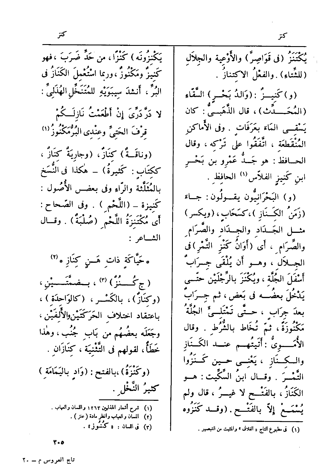يُكْتَنَزُ فِي قواصِرَّ والأَوعية والجِلال للشِّتاءِ. والفِعْل الاكْتِنازُ. كَنِيزٌ: والِدُ بَحْرٍ السَّقّاءِ المُحَدِّث، قَالَ الذَّهبيُّ: كَانَ يسْقِي المَاء بعرفاتٍ، وَفِي الأَماكن المُنقطعَةِ، اتَّفقُوا على تَركه، وَقَالَ الْحَافِظ: هُوَ جَدُّ عَمْرِو بنِ بحرِ بن كَنيزٍ الفَلاّس الْحَافِظ. البَحرانِيُّون يَقُولُونَ: جاءَ زَمَنُ الكِناز، كسَحابٍ، ويُكسَر مثل الجَداد والجِداد والصَّرامِ والصِّرامِ، أَي أَوانُ كَنْزِ التَّمْرِ فِي الجِلال، وَهُوَ أَن يُلْقَى جِرابٌ أَسفلَ الجُلَّةِ، ويُكْنَزَ بالرِّجلَين حتّى يدخُلَ بعضُ فِي بعض، ثمَّ جِرابٌ بعدَ جِرابٍ، حتّى تمتلئَ الجُلَّةُ مَكْنوزَةً، ثمَّ تُخاطُ بالشُّرَطِ، وَقَالَ الأُمَوِيُّ: أَتيتُهُم عندَ الكَنازِ والكِنازِ، يَعْنِي حِين كَنَزوا التَّمْرَ. وَقَالَ ابْن السِّكِّيت: هُوَ الكَنازُ، بِالْفَتْح. وَقد كَنَزوه يَكنِزونَه كَنْزاً، من حَدِّ ضَرَبَ، فَهُوَ كَنِيزٌ ومَكْنُوزٌ، ورُبَّما اسْتُعْمِلَ الكَنازُ فِي البُرِّ، أنْشد سِيبَوَيْهٍ للمُتَنَخِّلِ الهُذَلِيِّ: