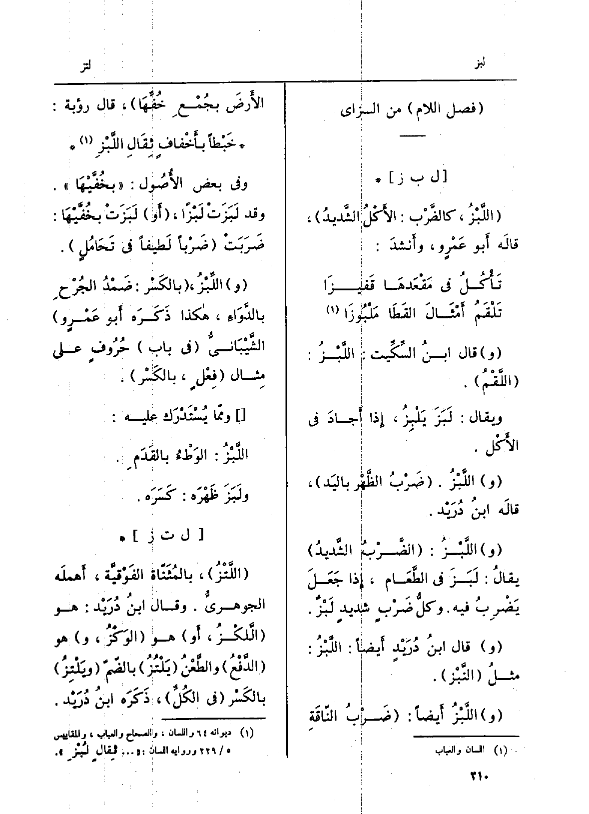 قَالَ ابْن السِّكِّيت: اللَّبْزُ: اللَّقْمُ. وَيُقَال: لَبَزَ يَلْبِزُ، إِذا أَجاد فِي الأَكل. اللَّبْزُ: ضَرْبُ الظَّهر باليَد، قَالَه ابْن دُريد. اللَّبْزُ: الضَّرْبُ الشَّديد، يُقَال: لَبَزَ فِي الطَّعام، إِذا جعلَ يضرِبُ فِيهِ، وكلُّ ضَربٍ شديدٍ لَبْزٌ. قَالَ ابْن دُرَيد أَيْضا: ضَرْبُ النّاقةِ الأَرضَ بجُمْعِ خُفِّها، قَالَ رُؤْبَةُ: خَبْطاً بأَخفافٍ ثِقال اللَّبْزِ وَفِي بعض الأُصول: بخُفَّيْها. وَقد لَبَزَتْ لَبْزاً، أَو لَبَزَتْ بخُفَّيْها: ضَرَبَتْ ضَرْباً لطيفاً فِي تَحامُلٍ. اللِّبْزُ، بالكسْر: ضَمْدُ الجُرْحِ بالدَّواءِ، هَكَذَا ذكرَه أَبو عَمرو الشَّيبانيُّ فِي بَاب حروفٍ على مِثَال فِعْلٍ، بالكَسْر. ومّا يُستدرك عَلَيْهِ: اللَّبْزُ: الوَطْءُ بالقَدَمِ. ولَبَزَ ظَهْرَهُ: كسرَه.