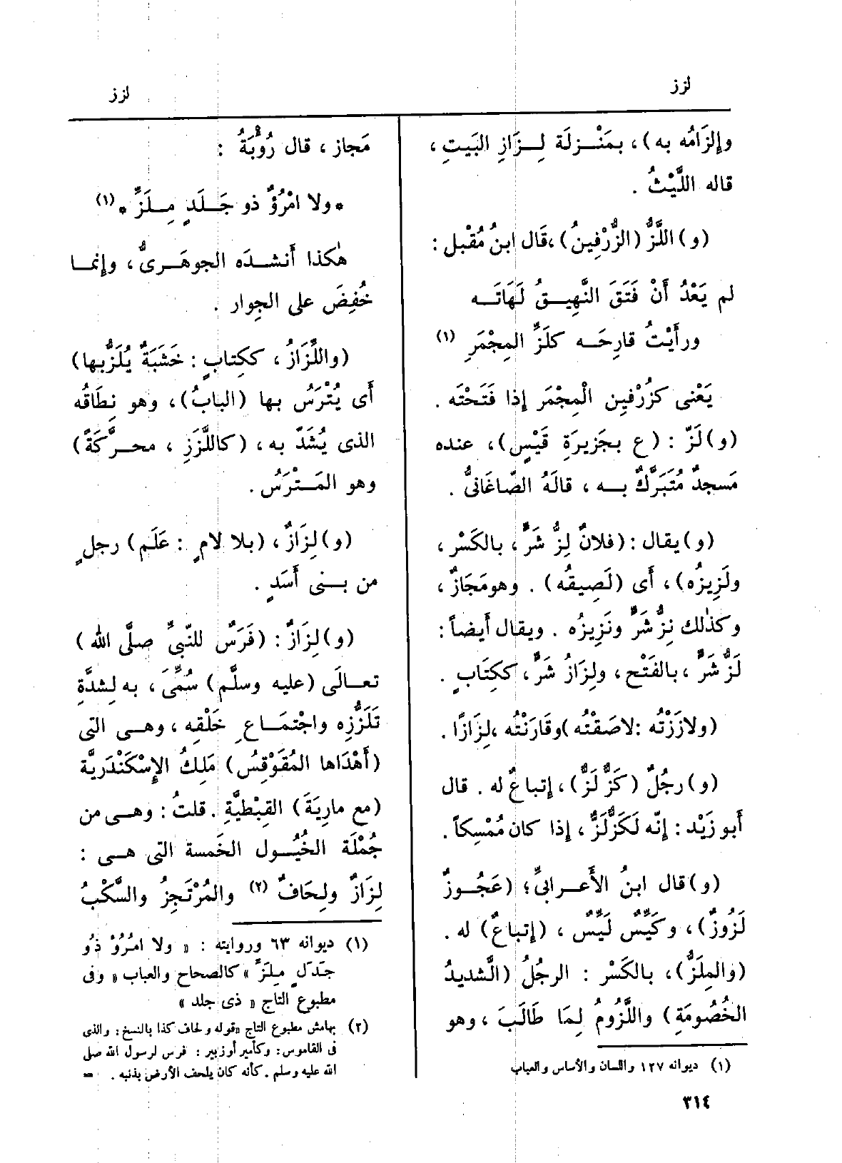 وإلْزامُه بِهِ، بمَنزلةِ {لِزازِ البيتِ، قَالَه اللَّيْث.} اللَّزُّ الزُّرْفِينُ، قَالَ ابنُ مُقبِل: