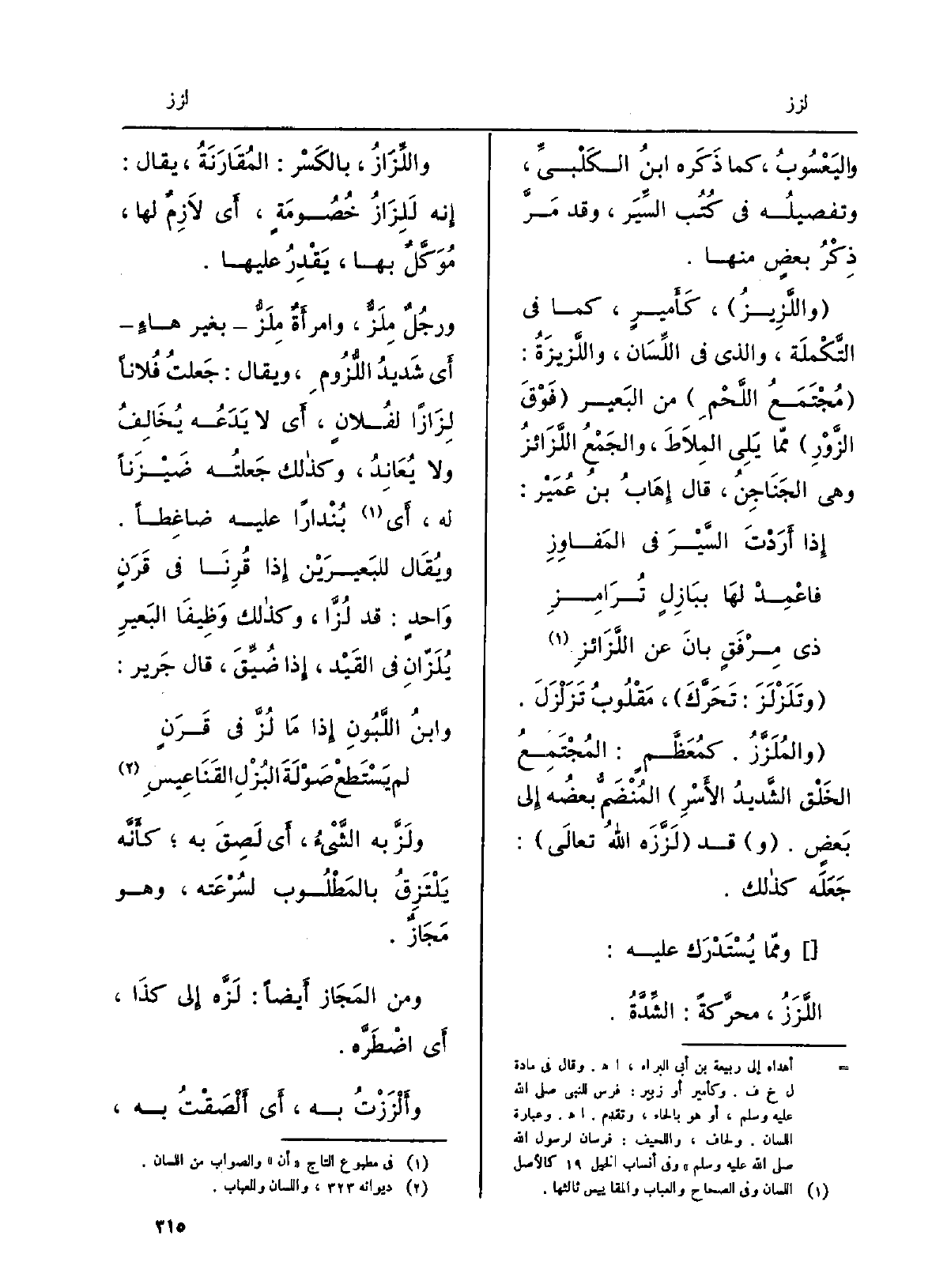 ورجلٌ {مِلَزٌّ، وامرأةٌ مِلَزُّ بغيرِ هاءٍ أَي شديدُ اللُّزومِ، وَيُقَال: جعلتُ فلَانا} لِزازاً لفلانٍ، أَي لَا يَدَعُه يُخالِفُ وَلَا يُعانِد، وَكَذَلِكَ جعلتُه ضَيْزَناً لَهُ، أَي بُنْداراً عَلَيْهِ ضاغِطاً. وَيُقَال للبَعيرَيْن إِذا قُرِنَا فِي قَرَنٍ واحدٍ: قد {لُزَّا، وَكَذَلِكَ وَظيفا البعيرِ} يُلَزَّانِ فِي الْقَيْد، إِذا ضُيِّقَ، قَالَ جَرير: