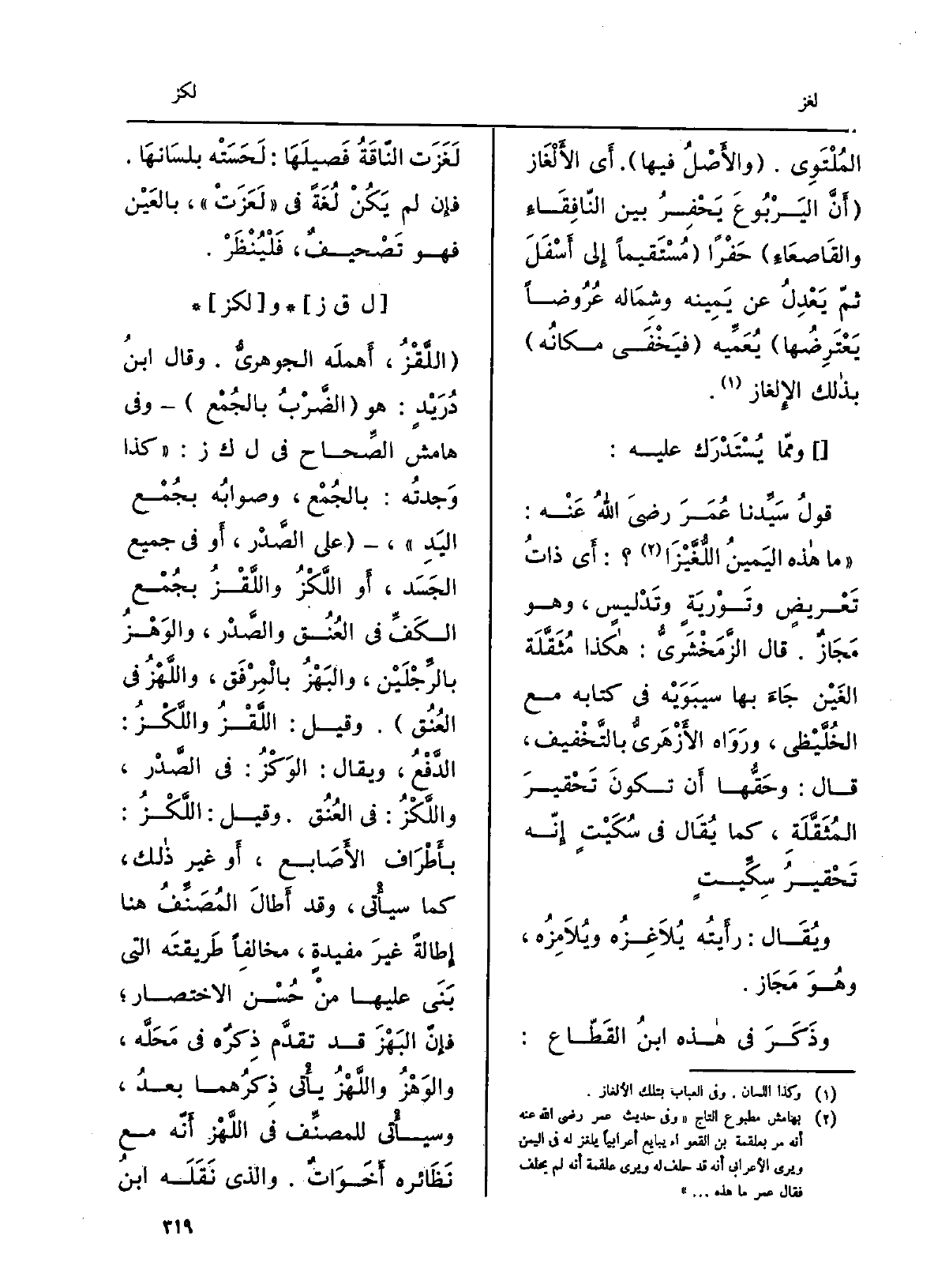 ُ المُلتَوي. والأصلُ فِيهَا. أَي الألْغاز أنّ اليَربوعَ يَحْفِرُ بَين النّافِقاءِ والقاصِعاءِ حَفْرَاً مُستَقيماً إِلَى أَسْفَلَ ثمَّ يَعْدِلُ عَن يمينِه وشِمالِه عُروضاً يَعْتَرِضُها يُعَمِّيه فَيَخْفى مكانُه بذلك الإلْغاز. ومِمّا يُسْتَدْرَك عَلَيْهِ: قولُ سيدنَا عمر رَضِي الله عَنهُ: مَا هَذِه اليمينُ اللُّغَّيْزا أَي ذاتُ تَعْرِيضٍ وتَوْرِيَةٍ وتَدْلِيسٍ، وَهُوَ مَجاز، قَالَ الزَّمَخْشَرِيّ: هَكَذَا مُثَقَّلة العينِ جاءَ بهَا سِيبَوَيْهٍ فِي كِتَابه مَعَ الخُلَّيْظى، وَرَوَاهُ الأَزْهَرِيّ بِالتَّخْفِيفِ، قَالَ: وحقُّها أَن تكون تَحْقِيرَ المُثَقَّلَةِ، كَمَا يُقَال فِي سُكَيْتٍ إنّه تحقيرُ سِكِّيتٍ. وَيُقَال: رأيتُه يُلاغِزُه ويُلامِزُه وَهُوَ مَجاز. وذكرَ فِي هَذِه ابنُ القَطّاع: لَغَزَت الناقةُ فصيلَها: لَحَسَتْه)