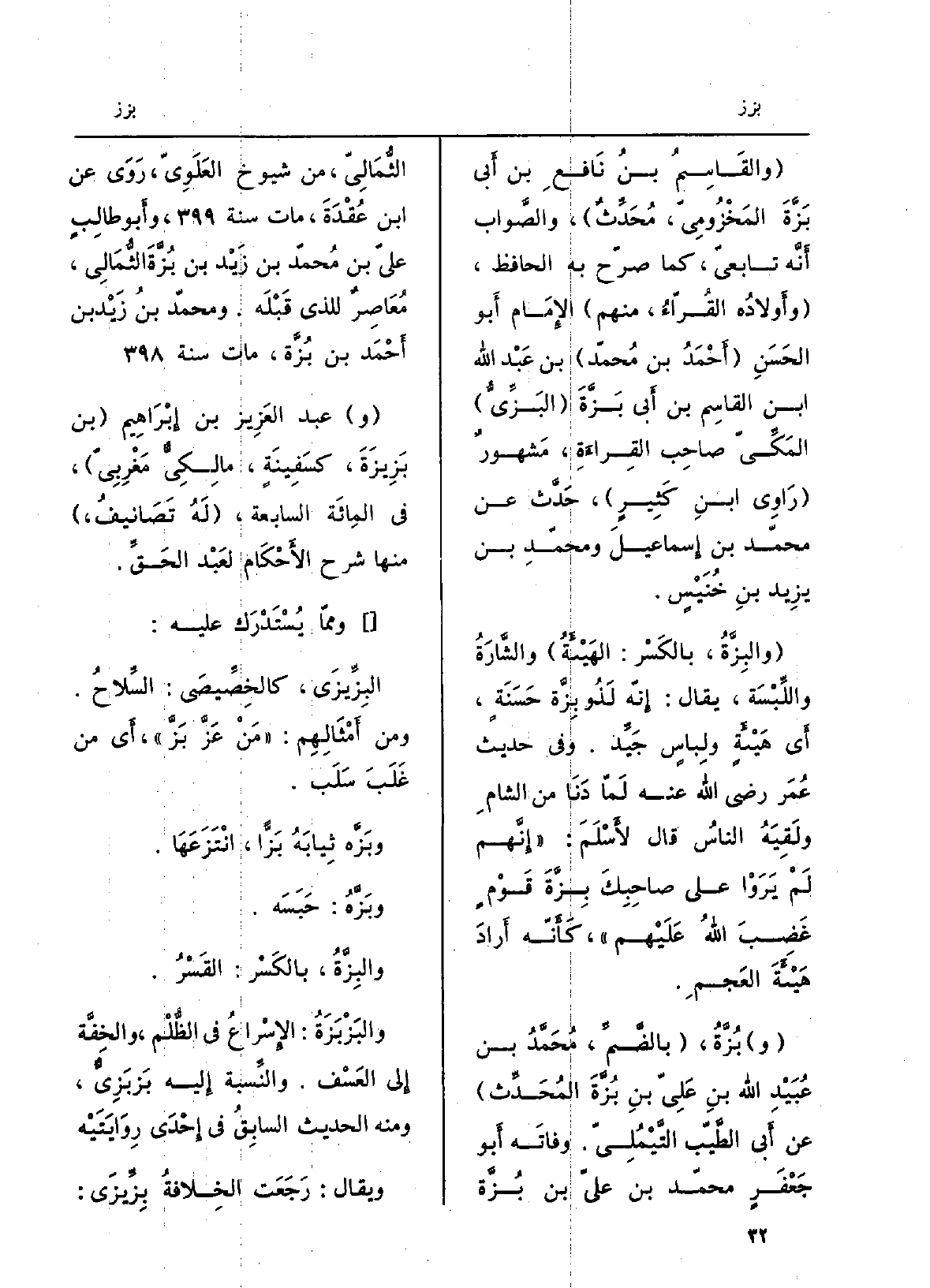 والقاسمُ بنُ نافعِ بن أبي {بَزَّةَ المَخزوميّ، مُحدِّثٌ، والصوابُ أنّه تابعيّ، كَمَا صرّح بِهِ الْحَافِظ، وأولادُه القُرّاء، مِنْهُم الإِمَام أَبُو الْحسن أحمدُ بن مُحَمَّد بن عَبْد الله بن الْقَاسِم بن أبي} بَزَّةَ {- البَزِّيُّ المَكِّيّ صاحبِ القِراءة، مَشْهُورٌ رَاوِي ابنِ كَثيرٍ، حدَّث عَن مُحَمَّد بن إِسْمَاعِيل وَمُحَمّد بن يزِيد بن خُنَيْس.} والبِزَّة، بِالْكَسْرِ: الهَيْئةُ والشّارةُ واللِّبْسَة، يُقَال: إنّه لذُو {بِزَّة حَسَنَةٍ، أَي هَيْئَةٍ ولِباسٍ جيِّد. وَفِي حَدِيث عمر رَضِي الله عَنهُ لمّا دَنا من الشامِ ولَقِيَه الناسُ قَالَ لأسْلَم: إنّهم لم يَرَوْا على صاحبِكَ} بِزَّةَ قَوْمٍ غَضِبَ اللهُ عليهِم، كأنّه أَرَادَ هَئْيَةَ العَجمِ. {بُزَّةُ، بالضمّ، مُحَمَّد بن عُبَيْد الله بن عليّ بن بُزَّةَ المُحدِّث عَن أبي الطَّيّب التَّيْمُلِيّ. وفاتَه أَبُو جَعْفَرٍ مُحَمَّد بن عليّ بن بُزَّة الثُّماليّ، من شُيُوخ العَلَويّ، روى عَن ابْن عُقْدَة، مَاتَ سنة، وَأَبُو طالبٍ عليّ بن مُحَمَّد بن زَيْد بن بُزَّةَ الثُّماليّ، مُعاصِرٌ للَّذي قَبْلَه. وَمُحَمّد بنُ زَيْد بن أَحْمد بن) بُزَّة، مَاتَ سنة. عبد الْعَزِيز بن إِبْرَاهِيم بن بَزيزة، كسَفينةٍ، مالِكِيٌّ مَغربِيّ، فِي المائةِ السَّابِعَة، لَهُ تَصانيف، مِنْهَا شرح الْأَحْكَام لعبد الحقِّ. ومِمّا يُسْتَدْرَك عَلَيْهِ:} البِزِّيزى، كالخِصِّيصى: السّلاح. وَمن أمثالِهم: مَن عزَّ {بَزَّ، أَي مَن غَلَبَ سَلَبَ.} وبَزَّه ثِيابَه {بَزَّاً، انْتزَعَها.