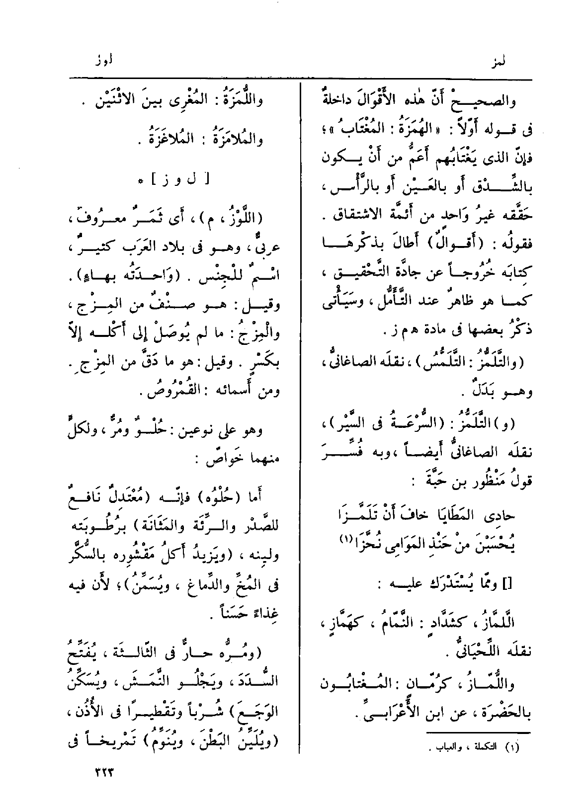 يكون بالشِّدْقِ أَو بالعَيْن أَو بِالرَّأْسِ، حقَّقَه غيرُ واحدٍ من أئمّةِ الِاشْتِقَاق. فقولُه: أقوالٌ أطالَ بذِكرِها كتابَه خُرُوجًا عَن جادَّةِ التّحقيق، كَمَا هُوَ ظاهرٌ عِنْد التَّأَمُّل، وَسَيَأْتِي ذِكرُ بَعْضهَا فِي مَادَّة همز. والتَّلَمُّز: التَّلَمُّس، نَقله الصَّاغانِيّ، وَهُوَ بدَلٌ. التَّلَمُّز: السرعةُ فِي السَّيْر، نَقله الصَّاغانِيّ أَيْضا، وَبِه فُسِّر قولُ مَنْظُورُ بن حَبَّةَ: