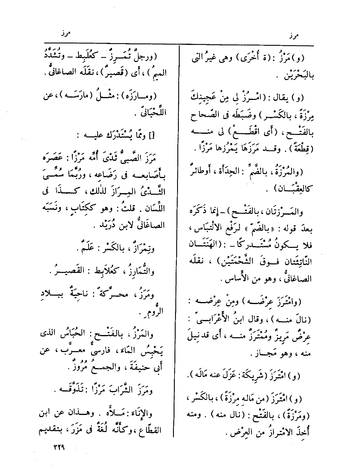مَرْزُ: ة أُخْرَى وَهِي غيرُ الَّتِي بالبحرَيْن. يُقَال: امْرُزْ لي من عَجينِك مِرْزَةً، بِالْكَسْرِ وضبطَه فِي الصِّحَاح بالفَتْح، أَي اقْطَع لي مِنْهُ قِطعةً. وَقد مَرَزَها يَمْرُزها مَرْزَاً. والمُرْزَة، بالضمّ: الحِدَأَة، أَو طائرٌ كالعِقْبان. والمَرْزَتان، بالفَتْح، إِنَّمَا ذَكَرَه بعد قولِه: بالضمّ لرفعِ الالْتِباس، فَلَا يكون مُستدرَكاً: الهَنَتان الناتِئَتان فوقَ الشَّحْمَتَيْن، نَقله الصَّاغانِيّ، وَهُوَ من الأساس. وامْتَرَزَ عِرضَه ومِن عِرضِه: نالَ مِنْهُ، وَقَالَ ابْن الأَعْرابِيّ: عِرْضٌ مَريزٌ ومُمْتَرَزٌ مِنْهُ، أَي قد نِيلَ مِنْهُ، وَهُوَ مَجاز. امْتَرزَ شَريكَة: عَزَلَ عَنهُ مالَه. امْتَرزَ من مالِه مِرزَةً، بِالْكَسْرِ، ومَرْزَةً، بالفَتْح: نَالَ مِنْهُ. وَمِنْه أُخِذَ الامْتِرازُ من العِرض. ورجلٌ تُمَرِزٌ كعُلَبِط وتُشدَّدُ الميمُ، أَي قصيرٌ، نَقله الصَّاغانِيّ. ومارَزَه: مثلُ مارَسَه، عَن اللِّحْيانيّ. ومِمّا يُسْتَدْرَك عَلَيْهِ: مَرَزَ الصبيُ ثَدْيَ أمِّه مَرْزَاً: عَصَرَه بأصابعِه فِي رَضاعِه، وربّما سُمِّي الثَّدْيُ المِرازَ لذَلِك، كَذَا فِي اللِّسان. قلتُ: وَهُوَ ككَتِابٍ، ونَسَبَه الصَّاغانِيّ لابنِ دُرَيْد. وتِمْراز، بِالْكَسْرِ: عَلَمٌ.