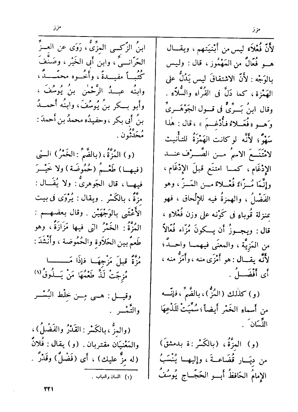 كَذَلِك {المُزُّ، بالضَّمّ، فإنّه من أسماءِ الخَمرِ أَيْضا سُمِّيت للَذْعِها اللِّسان.} المِزَّة، بالكَسْر: ة بِدِمَشْق من دِيارِ قُضاعة، وإليها يُنسَبُ الإمامُ الحافظُ أَبُو الحَجّاج يوسفُ بنُ الزّكي {- المِزِّيُّ، روى عَن العِزِّ الحَرّانيّ، وَابْن أبي الخَيْر، وصَنَّفَ كُتُباً مفيدةً، وَأَخُوهُ محمدٌ، وابنُه عبدُ الرَّحْمَن بنُ يُوسُف، وَأَبُو بكر بنُ يُوسُف، وابنُه أحمدُ بنُ أبي بكرٍ، وحفيدُه مُحَمَّد بن احْمَد: مُحدِّثون.