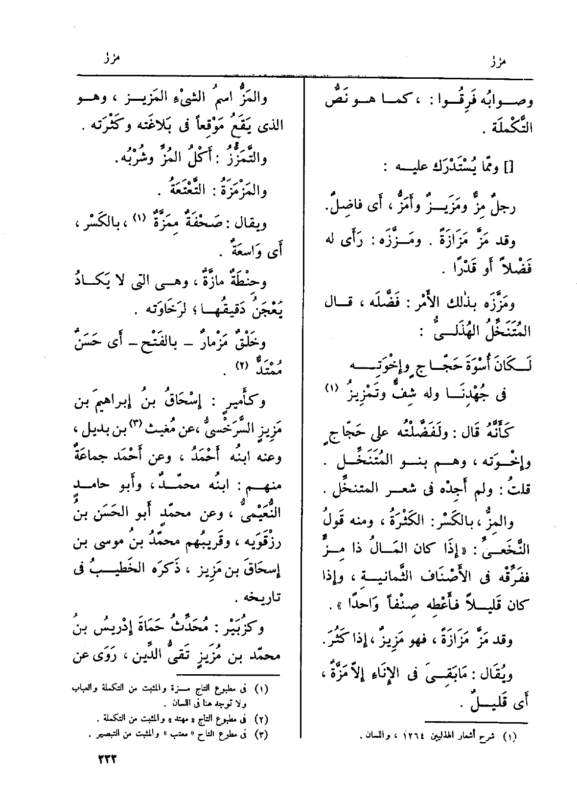 وحِنطَةٌ {مازَّةٌ، وَهِي الَّتِي لَا يكادُ يُعجَنُ دَقيقُها لرَخاوَتِه. وخَلقٌ مَزْمَازٌ بالفَتْح أَي حسَنٌ مُمْتَدٌّ. وكأميرٍ: إسحاقُ بنُ إبراهيمَ بن} مَزيزٍ السَّرْخَسيُّ، عَن مُغيث بن بديل، وَعنهُ ابنُه أَحْمد، وَعَن أحمدَ جماعةٌ مِنْهُم: ابنُه مُحَمَّد، وَأَبُو حامِدٍ النُّعَيْمِيّ، وَعَن مُحَمَّد أَبُو الحسَنِ بنُ رَزْقَوَيْه، وقريبُهم مُحَمَّد بنُ مُوسَى بن إسحاقَ بن! مَزيز، ذَكَرَه الخطيبُ فِي تَارِيخه. وكزُبَيْر: مُحدِّثُ حَماةَ إدريسُ بنُ مُحَمَّد بن مُزَيْزٍ تَقيُّ الدّين، روى عَن ابْن