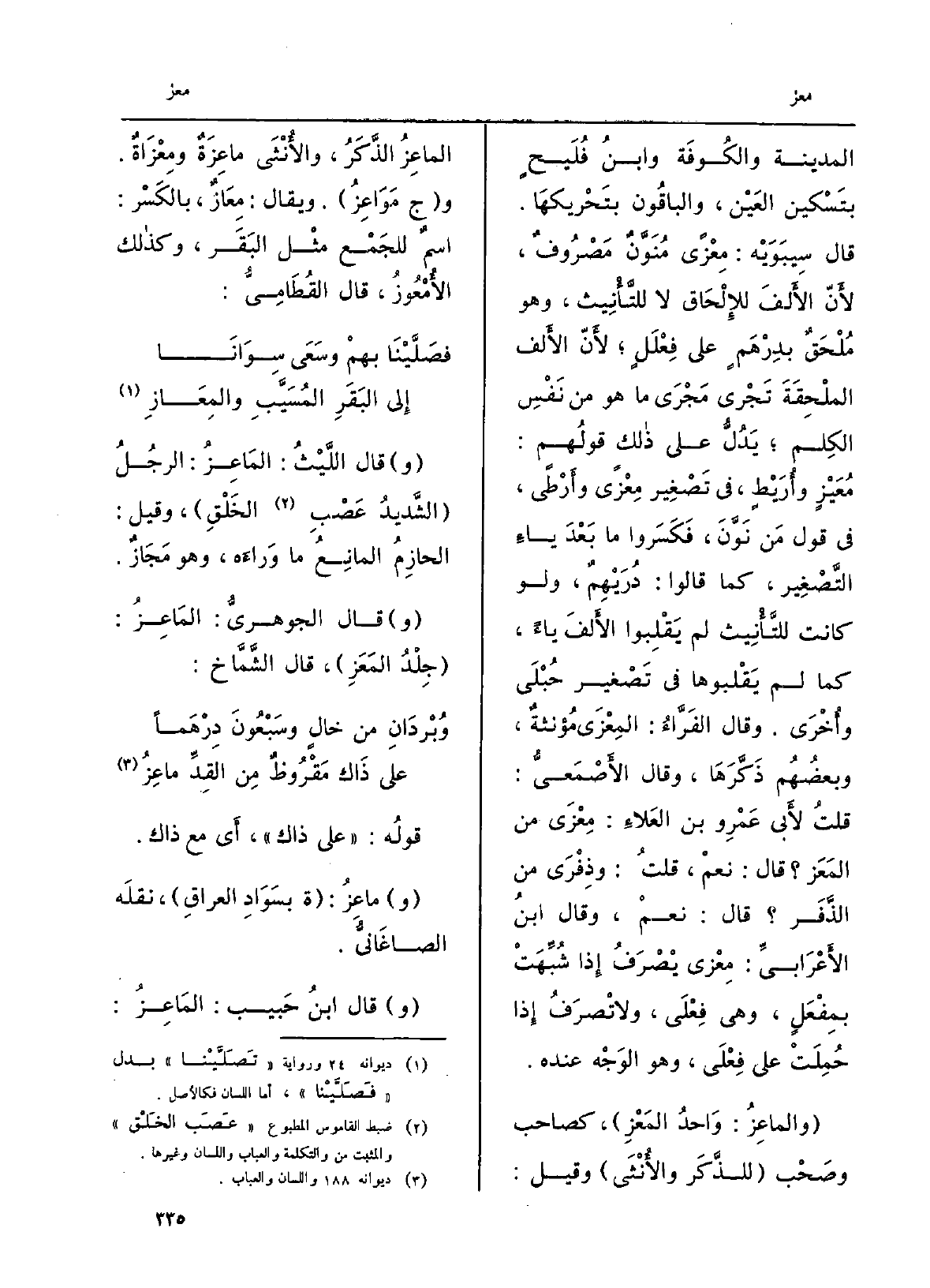 المدينةِ والكُوفةِ وابنُ فُلَيْحٍ بتَسكينِ العَين، والباقونَ بتَحريكِها. قَالَ سِيبَوَيْهٍ: مِعْزىً مُنَوَّنٍ مَصْرُوفٌ، لأنّ الألفَ للإلحاقِ لَا للتأنيث، وَهُوَ مُلحَقٌ بدِرْهَمٍ على فِعْلَلٍ، لأنّ الألفَ الملحِقَةَ تجْرِي مَجْرَى مَا هُوَ من نَفْسِ الكِلم يدلُّ على ذَلِك قَوْلُهم: مُعَيْزٍ وأُرَيْطٍ، فِي تصغيرِ مِعزىً وأَرْطَىً، فِي قَول من نَوَّن، فَكَسَروا مَا بَعْدَ ياءِ التصغير، كَمَا قَالُوا: دُرَيْهِم، وَلَو كَانَت للتأنيثِ لم يَقْلِبوا الألفَ يَاء، كَمَا لم يَقْلِبوها فِي تصغيرِ حُبْلى وأُخرى. وَقَالَ الفَرّاء: المِعْزى مؤنَّثةٌ، وبعضُهم ذَكَّرَها، وَقَالَ الأَصْمَعِيّ: قلتُ لأبي عَمْرِو بن الْعَلَاء: مِعْزى من المَعَز قَالَ: نَعَمْ، قلتُ: وذِفْرى من الذَّفَر قَالَ: نعم، وَقَالَ ابْن الأَعْرابِيّ: مِعزى يصرَفُ إِذا شُبِّهَتْ بمِفْعَلٍ، وَهِي فِعْلى، وَلَا تصرفُ إِذا حُمِلَت على فِعْلى، وَهُوَ الوَجهُ عِنْده. والماعِز: واحدُ المَعْز، كصاحب وصَحْب للذَّكَر والأُنثى وَقيل: الماعِزُ الذَّكَر، والأُنثى ماعِزَةٌ ومِعْزاةٌ. وَج مَواعِزُ. وَيُقَال: مِعازٌ، بالكَسْر: اسمٌ للجَمْع مثل البقَر، وَكَذَلِكَ الأُمْعوز، قَالَ القُطاميُّ: