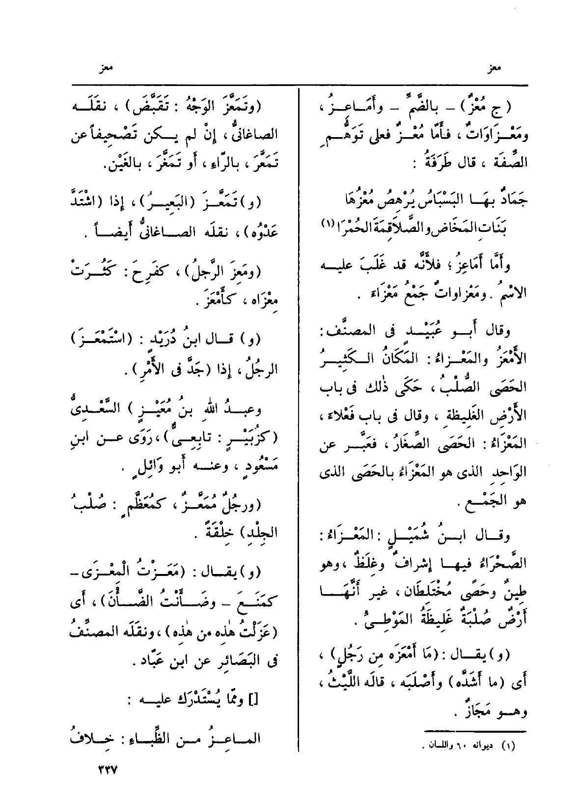 وأمّا أماعِز فلأنّه قد غَلَبَ عَلَيْهِ الاسمُ. ومَعْزَاوات جَمْعُ مَعْزَاء. وَقَالَ أَبُو عُبَيْد فِي المُصَنِّف: الأَمْعَزُ والمَعْزاء: المكانُ الكثيرُ الحَصى الصُّلب، حكى ذَلِك فِي بَاب الأرضِ الغليظة، وَقَالَ فِي بَاب فَعْلاء، المَعْزاء: الحَصى الصِّغار، فعَبَّرَ عَن الواحدِ الَّذِي هُوَ المَعْزاءُ بالحَصى الَّذِي هُوَ الجَمع. وَقَالَ ابنُ شُمَيٍْ: المَعْزاء: الصَّحراءُ فِيهَا إشرافٌ وغِلَظٌ، وَهُوَ طِينٌ وحَصىً مُختَلِطان، غيرَ أنّها أرضٌ صُلبةٌ غليظةُ المَوْطِئ. يُقَال: مَا أَمْعَزَه من رجلٍ، أَي مَا أشَدَّه وأَصْلَبَه، قَالَه اللَّيْث، وَهُوَ مَجاز. وَتَمَعَّزَ الوَجهُ: تَقَبَّضَ، نَقله الصَّاغانِيّ، إِن لم يكن تَصحيفاً عَن تمَعَّرَ، بالراء، أَو تمَغَّرَ، بالغين. تمَعَّزَ البعيرُ، إِذا اشْتدَّ عَدْوُه، نَقله الصَّاغانِيّ أَيْضا. ومَعِزَ الرجلُ، كفَرِح: كَثُرَتْ مِعْزاه، كَأَمْعز. قَالَ ابنُ دُرَيْدٍ: اسْتَمْعَزَ الرجلُ، إِذا جَدَّ فِي الْأَمر. وعَبْد)