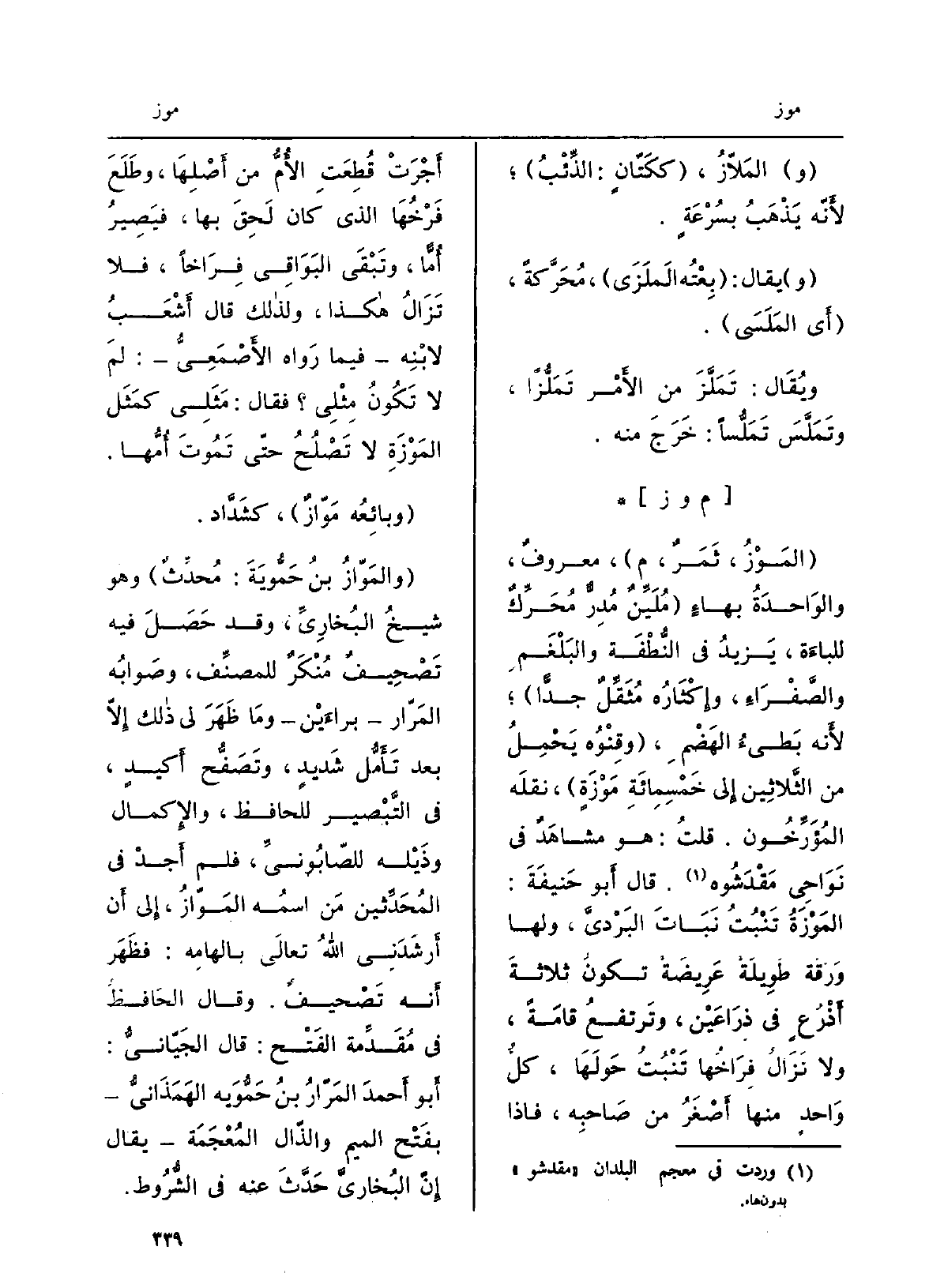 {المَوْز، ثمرٌ مَعْرُوف، والواحدةُ بهاءٍ مُلَيِّنٌ مُدِرٌّ مُحرِّكٌ للباءَة، يزيدُ فِي النُّطفةِ والبَلغَمِ والصَّفراءِ، وإكثارُه مُثَقِّلٌ جدا لأنّه بطيءُ الهَضم، وقِنْوُه يحملُ من الثَّلَاثِينَ إِلَى خمسمائةِ} مَوْزَةٍ، نَقله المُؤرِّخون. قلتُ: هُوَ مشاهَدٌ فِي نواحي مَقْدَشُوه. قَالَ أَبُو حنيفَة: {المَوزةُ تَنْبُتُ نباتَ البَرْديَّ، وَلها ورقةٌ طويلةٌ عريضةٌ تكون ثلاثةَ أَذْرُعٍ فِي ذراعَيْن، وترتفعُ قامَةً، وَلَا تزالُ فِراخُها تَنْبُتُ حَوْلَها، كلُّ واحدٍ مِنْهَا أصغرُ من صاحبِه، فَإِذا أَجْرَتْ قُطِعَت الأمُّ من أَصْلِها، وطَلَعَ فَرْخُها الَّذِي كَانَ لَحِقَ بهَا، فيصيرُ أُمَّاً، وَتبقى البَواقي فِراخاً، فَلَا تزالُ هَكَذَا، وَلذَلِك قَالَ أَشْعَبُ لابنِه فِيمَا رَوَاهُ الأَصْمَعِيّ: لمَ لَا تكونُ مِثلي فَقَالَ: مِثلي كَمَثَل المَوْزَةِ لَا تصلحُ حَتَّى تموتَ أُمُّها. وبائِعُه} مَوَّازٌ، كشَدَّاد. {والمَوّازُ بن حَمُّويَةَ: مُحدِّثٌ وَهُوَ شيخُ البُخاريِّ، وَقد حَصَلَ فِيهِ تَصحيفٌ مُنكَرٌ للمصنِّف، وصوابُه المَرّار براءَيْن وَمَا ظَهَرَ لي ذَلِك إلاّ بعد تأمُّلٍ شَدِيد، وتَصَفُّحٍ أكيدٍ، فِي التبصير لِلْحَافِظِ، والإكمال وذَيْله للصابونيّ، فَلم أَجِدْ فِي المُحدِّثين من اسمُه} المَوَّاز، إِلَى أَن أَرْشَدني اللهُ تَعَالَى بإلهامِه: فَظَهَر أَنه تَصْحِيفٌ. وَقَالَ الحافظُ فِي مُقدِّمةِ الفَتح: قَالَ الجَيّانيُّ: أَبُو أحمدَ المَرّارُ بنُ حَمُّويَه الهَمَذانيُّ بِفَتْح الْمِيم والذال المُعجمَة يُقَال إنّ البُخاريَّ حدَّث عَنهُ فِي الشُّروط.