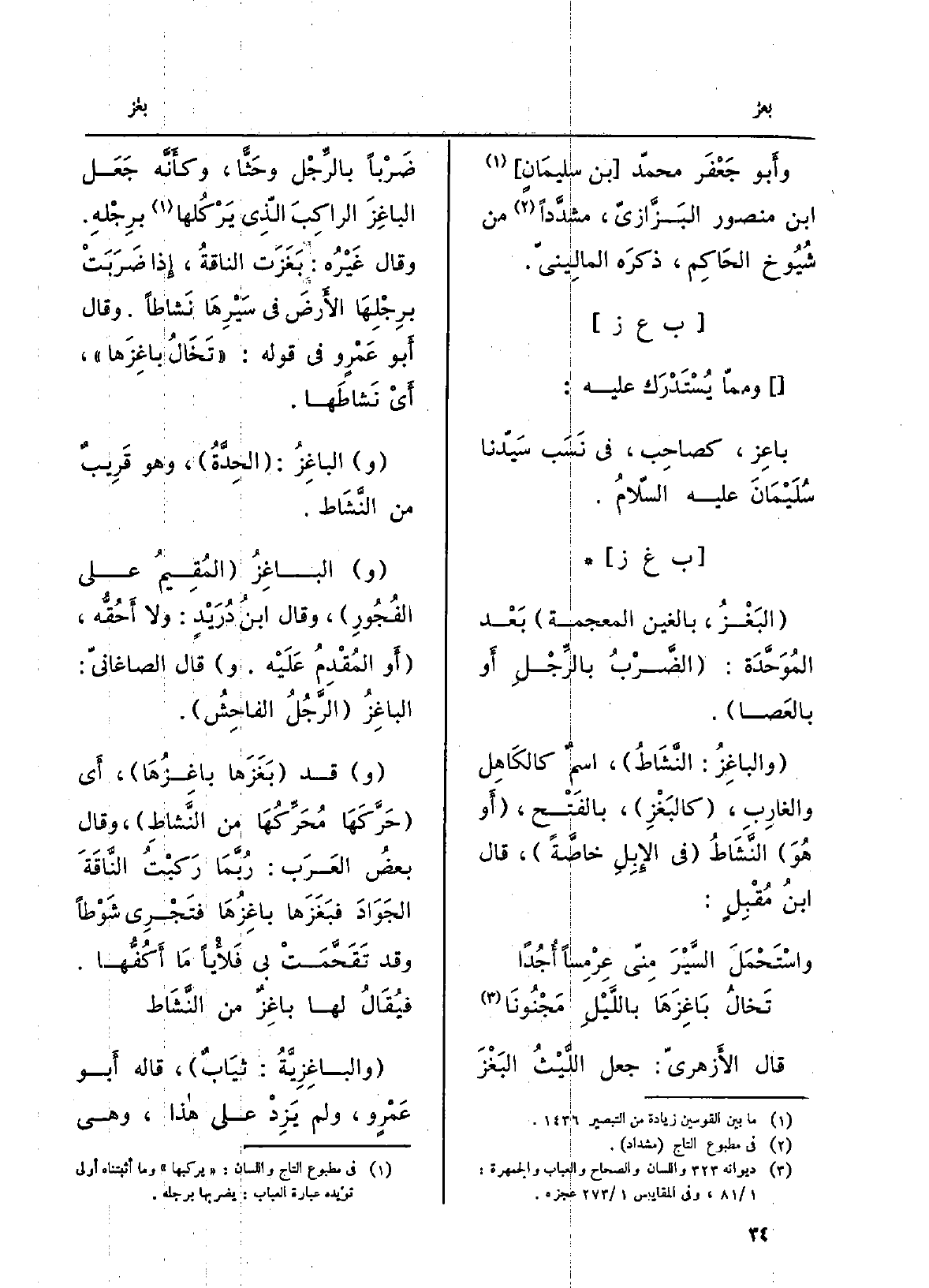 البَغْز، بالغين الْمُعْجَمَة بعد المُوَحَّدة: الضربُ بالرِّجل أَو بالعَصا. والباغِزُ: النَّشَاط، اسمٌ كالكاهِل والغارِب، كالبَغْزِ، بِالْفَتْح، أَو هُوَ النَّشاطُ فِي الإبلِ خاصّةً، قَالَ ابنُ مُقبِل: