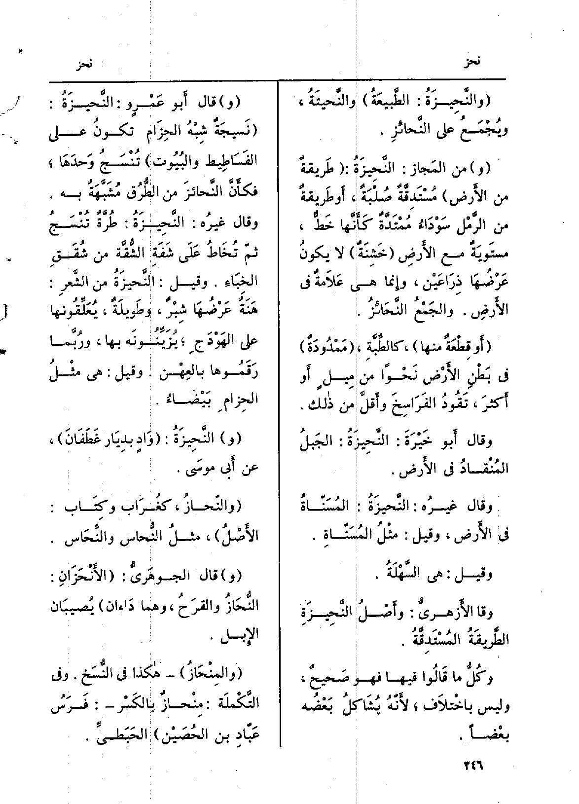والجَمعُ النَّحائزُ. أَو قِطعةٌ مِنْهَا، كالطِّبَّةِ، مَمْدُودةٌ فِي بَطْنِ الأَرْض نَحْوَاً من مِيلٍ أَو أكثرَ، تَقودُ الفَراسخَ وأقلَّ من ذَلِك. وَقَالَ أَبُو خَيْرَةَ: النَّحيزَةُ: الحبَلُ المُنْقادُ فِي الأَرْض. وَقَالَ غيرُه: النَّحيزَةُ: المُسَنَّاةُ فِي الأَرْض، وَقيل: مثلُ المُسَنّاة. وَقيل: هِيَ السَّهْلة. وَقَالَ الأَزْهَرِيّ: وأصلُ النَّحيزَةِ الطريقةُ المُستَدِقَّة. وكلُّ مَا قَالُوا فِيهَا هُوَ صحيحٌ، وَلَيْسَ باختِلاف لأنّه يُشاكِلُ بَعْضُه بَعْضًا. قَالَ أَبُو عمروٍ: النَّحيزَة: نَسيجةٌ شِبهُ الحِزام تكونُ على الفَساطيط والبيوت تُنسَجُ وَحْدَها فكأنّ النَّحائزَ من الطرُقِ مُشبَّهَةٌ بِهِ. وَقَالَ غيرُه: النَّحيزَة: طُرَّةٌ تُنسَجُ ثمّ تُخاطُ على شَفَةِ الشُّقَّةِ من شُقَقِ الخِباء. وَقيل: النَّحيزَةُ من الشَّعرِ: هَنَةٌ عَرْضُها شِبرٌ، وطويلةٌ، يُعَلِّقونَها على الهًوْدَج، يُزَيِّنونَه بهَا، وربّما رَقَمُوها بالعِهْن. وَقيل: هِيَ مثلُ الحِزامِ بَيْضَاء. النَّحِيزَة: وادٍ بديارِ غَطَفَان، عَن أبي مُوسَى. والنّحاز، كغُراب وكِتاب: الأَصْل، مثلُ النُّحاس والنِّحاس. قَالَ الجَوْهَرِيّ: الأَنْحَزان: النُّحازُ والقرَح، وهما داءان يُصيبان الْإِبِل. والمِنْحازُ هَكَذَا فِي النُّسَخ وَفِي التكملة: مِنْحازٌ بِالْكَسْرِ: فرَسُ عَبّاد بن الحُصَيْن الحَبَطيّ.