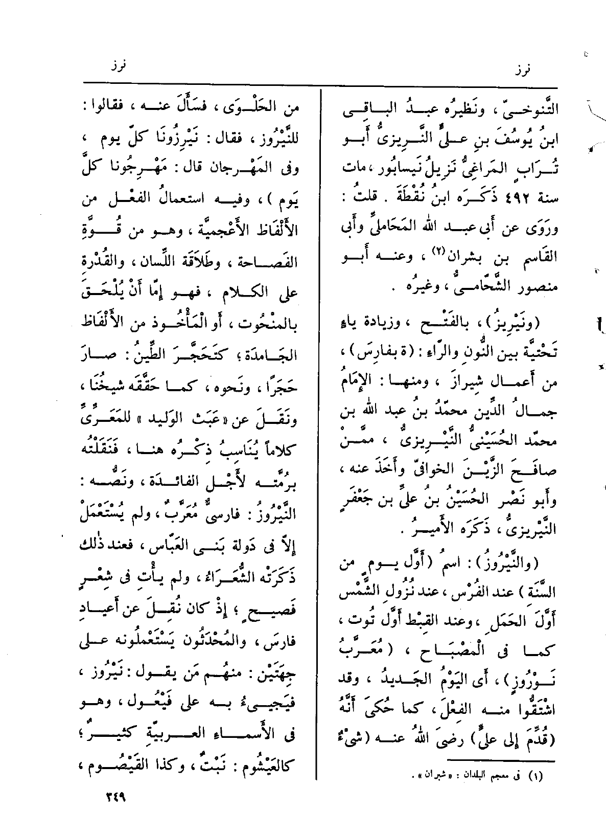 التَّنوخيّ، ونَظيرُه عبدُ الْبَاقِي بنُ يوسفَ بن عليّ النَّرِيزيُّ أَبُو تُرابٍ المَراغيًّ نزيلُ نَيْسَابور، مَاتَ سنة ذَكَرَه ابنُ نُقطَة. قلتُ: وروى عَن أبي عَبْد الله المَحامِليِّ وَأبي الْقَاسِم بن بَشرَان، وَعنهُ أَبُو مَنْصُور الشَّحّاميُّ، وغيرُه. ونَيْرِيز، بالفَتْح، وزيادةِ ياءٍ تحتيَّةٍ بَين النُّون والراءِ: ة بفارِس، من أَعمال شِيراز، وَمِنْهَا: الإمامُ جمالُ الدّين مُحَمَّد بن عَبْد الله بن مُحَمَّد الحُسَيْنيُّ النَّيْرِيزيُّ، ممّن صافَحَ الزَّيْنَ الخوافي وأخذَ عَنهُ، وَأَبُو نَصْر الْحُسَيْن بنُ عليِّ بن جَعْفَرٍ النَّيْريزيّ، ذكره الْأَمِير. والنَّيْروز: اسمُ أوّل يومٍ من السَّنَةِ عِنْد الفُرْس، عِنْد نُزولِ الشمسِ أوّلَ الحمَلِ، وعندَ القِبْط أوّل تُوت، كَمَا فِي الْمِصْبَاح، مُعرَّبُ نَوْرُوزٍ، أَي اليومُ الْجَدِيد، وَقد اشتَقُّوا مِنْهُ الفِعلَ، كَمَا حُكِيَ أنّه قُدِّم إِلَى عليٍّ رَضِي الله عَنهُ شيءٌ من الحَلْوى، فسألَ عَنهُ، فَقَالُوا: للنَّيْروز، فَقَالَ: نَيْرِزُونا كلّ يَوْم، وَفِي المَهْرجان قَالَ: مَهْرِجونا كلَّ يَوْم، وَفِيه استعمالُ الْفِعْل من الْأَلْفَاظ الأعجميّة، وَهُوَ من قُوَّةِ الفَصاحة، وطَلاقةِ اللِّسان، والقُدرة على الْكَلَام، فَهُوَ إمّا أَن يُلحَق بالمَنْحوت، أَو الْمَأْخُوذ من الْأَلْفَاظ الجامدة كتحَجَّرَ الطِّينُ: صارَ حَجَرَاً، وَنَحْوه، كَمَا حقَّقه شَيْخُنا، ونقلَ عَن عَبَثِ الوَليد للمَعَريِّ كلَاما يُناسِبُ ذِكرُه هُنَا، فَنَقَلتُه برُمَّته لأجلِ الفائدةِ، ونصُّه: النَّيْروز: فارسيٌّ مُعرَّبٌ، وَلم) يُستعمَلْ إلاّ فِي دولة بني العبّاس، فَعِنْدَ ذَلِك ذَكَرَتْه الشعراءُ، وَلم يَأْتِ فِي شِعرٍ فَصيحٍ إِذْ كَانَ نُقِلَ عَن أعيادِ فَارس، والمُحدِّثونَ يستعملونه على جِهتَيْن: مِنْهُم من يَقُول: نَيْرُوز، فيَجيءُ بِهِ على فَيْعُول، وَهُوَ فِي الْأَسْمَاء العربيّة كثيرا كالعَيْشوم: نَبْتٌ، وَكَذَا القَيْصوم،