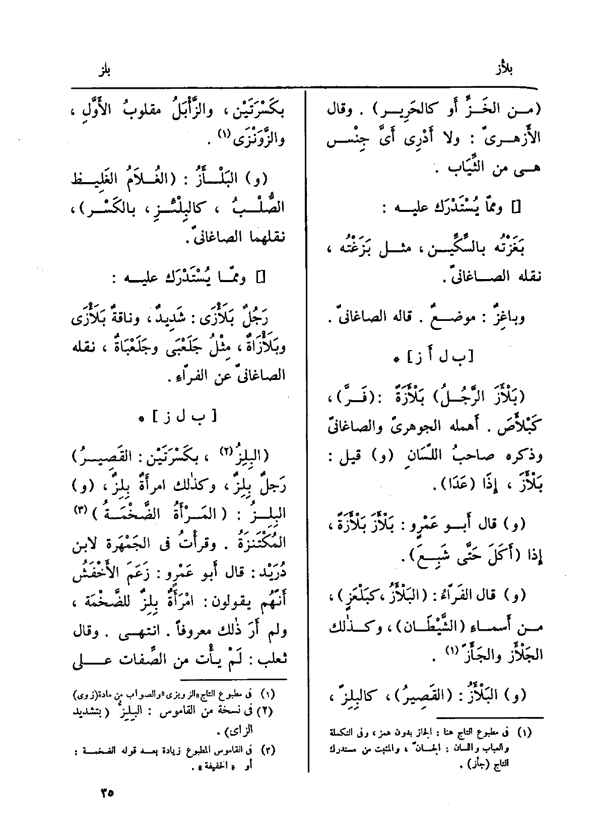 {بلأَزَ الرجلُ} بَلأَزَةً: فَرَّ، كبَلأَص. أهمله الجَوْهَرِيّ والصَّاغانِيّ وَذكره صاحبُ اللِّسان وَقيل: {بَلأَزَ: إِذا عَدا. قَالَ أَبُو عمروٍ:} بَلأَزَ {بَلأَزَةً، إِذا أَكَلَ حَتَّى شَبِعَ. قَالَ الفَرّاء:} البَلأَزُ، كَبَلْعَزٍ، من أسماءِ الشَّيْطان، وَكَذَلِكَ الجَلأَز والجَأَزّ. البَلأَز: القصيرُ، كالبِلِزّ، بكسرتَيْن، والزَّأْبَلُ مقلوبُ الأوّل، والزَّوْنَزى. {البَلْأَزُ: الغلامُ الغليظ الصُّلْب،} كالبِلْئِز، بِالْكَسْرِ، نقلهما الصَّاغانِيّ. ومِمّا يُسْتَدْرَك عَلَيْهِ: رجلٌ {بَلأْزَى: شديدٌ، وناقةٌ} بَلأْزى! وبلأَزاةٌ، مثلُ جَلَعْبى وجَلَعْباةٌ، نَقله الصَّاغانِيّ عَن الفَرّاء.