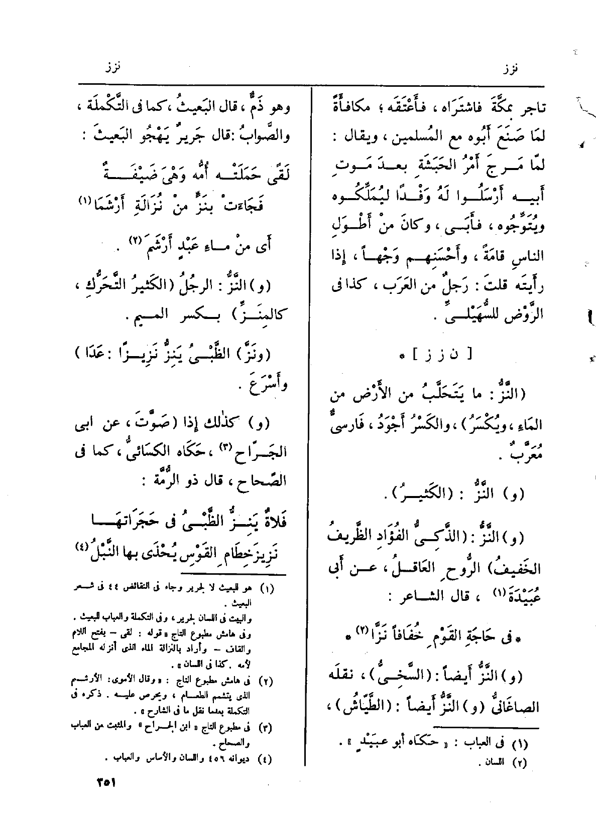 {النَّزُّ: مَا يَتَحَلَّبُ من الأَرْض من المَاء، ويُكسَر، والكَرُ أَجْوَدُ، فارسيٌّ مُعرَّبٌ.} النَّزُّ: الْكثير.