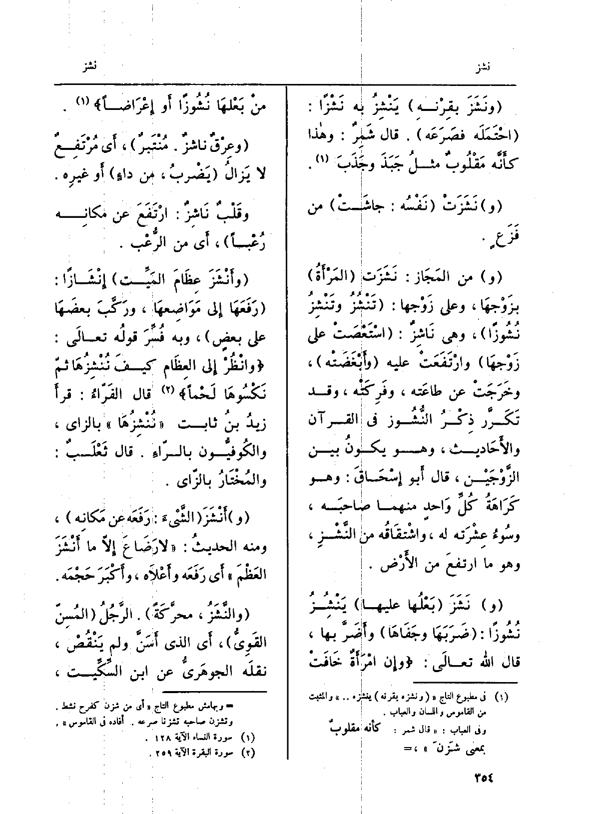 ونَشَزَ بقِرنِه يَنْشِزُ بِهِ نَشْزَاً: احْتملَه فَصَرَعه. قَالَ شَمِرٌ: وَهَذَا كأنّه مقلوبٌ مثلُ جَبَذَ وجَذَبَ. نَشَزَتْ نَفْسُه: جاشَتْ من فَزَعٍ. منَ المَجاز: نَشَزَت المرأةُ بزَوجِها، وعَلى وَزْجِها: تَنْشُزُ وتَنْشِزُ نُشوزاً، وَهِي ناشِزٌ: اسْتَعصتْ على زَوْجِها وارْتفعَتْ عَلَيْهِ وأَبْغَضَتْه، وخَرَجَتْ عَن طَاعَته، وفَرِكَتْه، وَقد تكَرَّرَ ذِكرُ النُّشوز فِي الْقُرْآن وَالْأَحَادِيث، وَهُوَ أَن يكونُ بَين الزَّوْجَيْن، قَالَ أَبُو إِسْحَاق: وَهُوَ كَراهةُ كلِّ واحدٍ مِنْهُمَا صاحبَه، وسُوءُ عِشْرَته لَهُ، واشْتِقاقُه من النَّشْز، وَهُوَ مَا ارْتَفع من الأَرْض. نَشَزَ بَعْلُها عَلَيْهَا يَنْشُزُ نُشوزاً: ضَرَبَها وجَفاها وأَضَرَّ بهَا، قَالَ اللهُ تَعَالَى: وإنْ امرأةٌ خافَتْ مِن بَعْلِها نُشوزاً أَو إعْراضاً وعِرْقٌ ناشزٌ: مُنْتَبِرٌ، أَي مُرتَفِعٌ لَا يزالُ يضربُ، من داءٍ أَو غيرِه. وقَلبٌ ناشِزٌ: ارتفعَ عَن مكانِه رُعْباً، أَي من الرُّعْب. وأَنْشَزَ عِظامَ المَيِّت إنْشازاً: رَفَعَها إِلَى مَواضِعها، ورَكَّبَ بَعْضَها على بعضٍ، وَبِه فُسِّرَ قَوْله تَعالى: وانظُر إِلَى العِظامِ كيفَ نُنْشِزُها ثمّ نَكْسُوها لَحْمَاً قَالَ الفَرّاء: قَرَأَ زيدُ بنُ ثَابت نُنْشِزُها بالزاي، والكُوفيُّون بالراء. قَالَ ثعلبٌ: والمُختارُ بالزاي. أَنْشَزَ الشيءَ: رَفَعَه عَن مكانِه، وَمِنْه الحَدِيث: لَا رَضاعَ إلاّ مَا أَنْشَزَ العَظمَ أَي رَفَعَه وأَعْلاه، وأَكْبَرَ حَجْمَه. والنَّشْزُ، محرّكةً. الرجلُ المُسِنُّ القويُّ، أَي الَّذِي أَسَنَّ وَلم يَنْقُصْ، نَقله الجَوْهَرِيّ عَن ابْن السِّكِّيت،