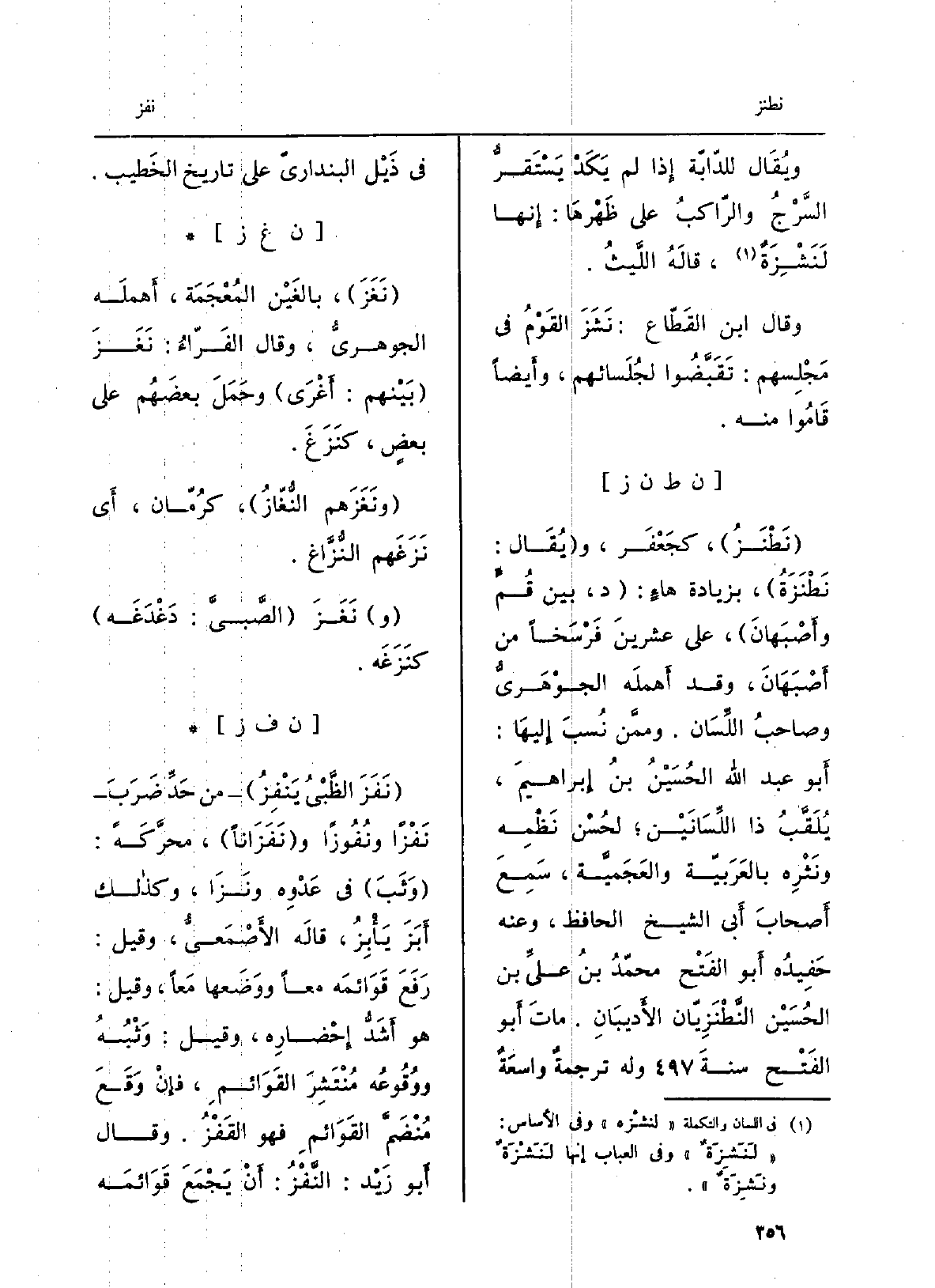 نَطْنَزَ، كَجَعْفَر، وَيُقَال: نَطْنَزَة، بزيادةِ هاءٍ: د، بَين قُمٍّ وأَصْبَهان، على عشْرين فَرْسَخاً من أَصْبَهان، وَقد أهمله الجَوْهَرِيّ وصاحبُ اللِّسان. وممّن نُسِبَ إِلَيْهَا: أَبُو عَبْد الله الْحُسَيْن بنُ إِبْرَاهِيم، يُلقَّبُ ذَا اللِّسانَيْن لحُسنِ نَظْمِه ونَثْرِه بالعربيّةِ والعَجَميَّة، سَمِعَ أصحابَ أبي الشَّيْخ الْحَافِظ، وَعنهُ حفيدُه أَبُو الفَتحِ مُحَمَّد بن عليِّ بن الْحُسَيْن النَّطْنَزِيَّان الأَديبان. مَاتَ أَبُو الفَتح سنة وَله ترجمةٌ واسعةٌ فِي ذَيْلِ البنداري على تَارِيخ الْخَطِيب.