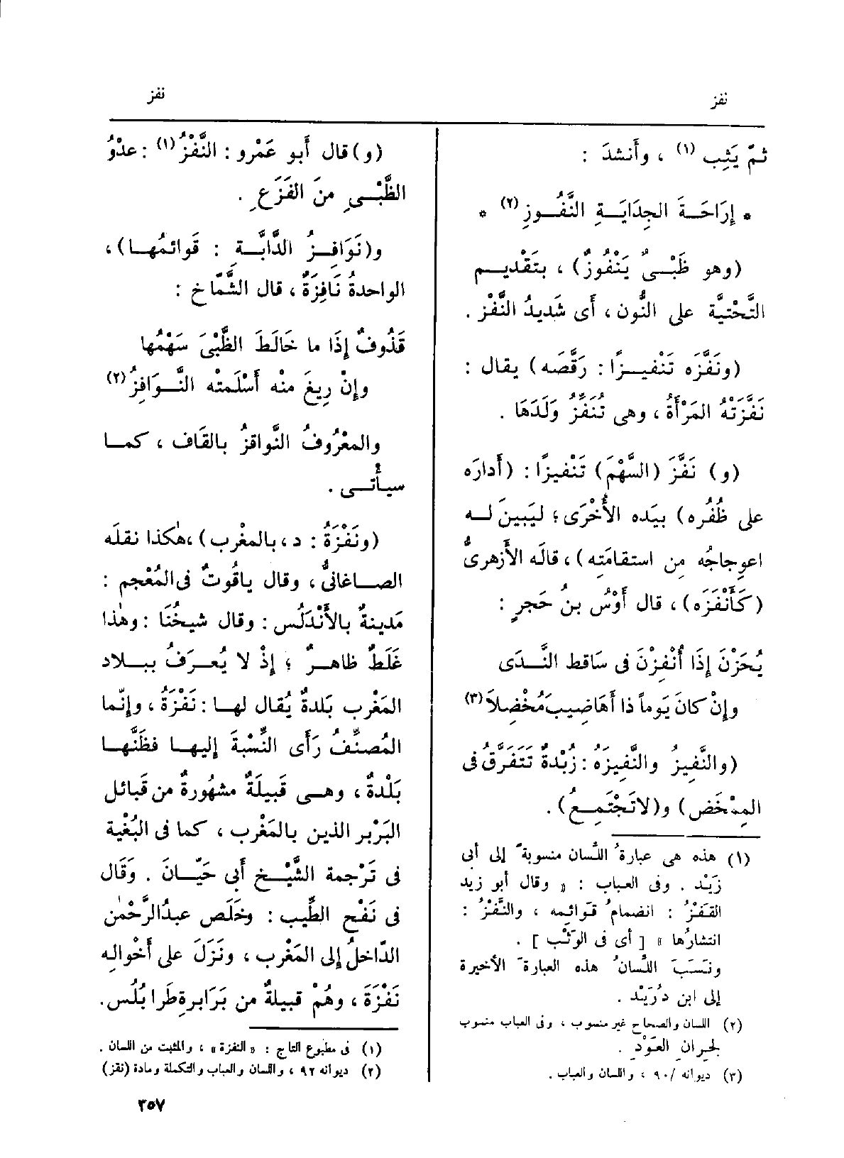 ثمَّ يَثِب، وَأنْشد: إراحَةَ الجِدايَةِ النَّفُوزِ وَهُوَ ظَبْيٌ يَنْفُوزٌ، بِتَقْدِيم التَّحتيَّةِ على النُّون، أَي شديدُ النَّفْز. ونفَّزَه تَنْفِيزاً: رقَّصَه يُقَال: نفَّزَتْه المرأةُ، وَهِي تُنَفِّزُ وَلَدَها. نفَّزَ السَّهمَ تَنْفِيزاً: أدارَه على ظُفُره بِيَدِهِ الأُخرى ليَبينَ لَهُ اعوِجاجُه من استقامتِه، قَالَه الأَزْهَرِيّ كَأَنْفَزَه، قَالَ أَوْسُ بنُ حَجرٍ:
