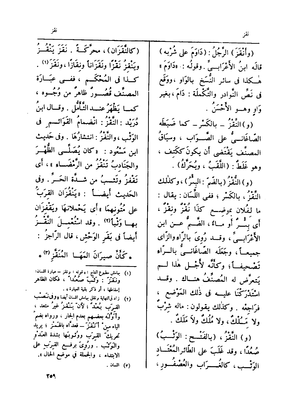 واَنْقَزَ الرجلُ: داوَمَ على شُربِه. قَالَه ابْن الأَعْرابِيّ. وقولُه: داوَمَ هَكَذَا فِي سَائِر النُّسَخ بِالْوَاو، وَوَقَع فِي نصِّ النَّوادرِ والتكملة: دامَ، بغيرِ واوٍ وَهُوَ الْأَحْسَن. النِّقْز بالكَسْر كَمَا ضَبَطَه الصَّاغانِيّ على الصَّوَاب، وسِياقُ المُصَنِّف يَقْتَضي أَن يكون ككَتِف، وَهُوَ غلَطٌ: اللقَبُ، ويُحرَّك. النُّقْز بالضَّمّ: البِئْر، وَكَذَلِكَ النِّقْز، بالكَسْر فَفِي اللِّسان: يُقَال: مَا لفلانٍ بموضِع كَذَا نُقْزٌ ونِقْزٌ، أَي بِئرٌ أَو ماءٌ، الضمُّ عَن ابْن الأَعْرابِيّ، وَقد رُوِيَ بالراءِ وَالزَّاي جَمِيعًا وكأنّه لأجلِ هَذَا لم يَتَعَرَّض لَهُ المُصَنِّف هُنَاكَ، وَقد استدْرَكْنا عَلَيْهِ فِي ذَلِك الموضِع، فراجِعْه. وَكَذَلِكَ يَقُولُونَ: مَاله شِرْبٌ وَلَا مَلْكٌ، وَلَا مُلُكٌ وَلَا مَلَكٌ. النَّقْزُ، بالفَتْح: الوَثب صُعُداً، وَقد غَلَبَ على الطائرِ المُعتادِ الوَثْب، كالغُراب والعُصفورِ، كالنَّقَزان، محرّكةً. نَقَزَ يَنْقُزُ ويَنْقِزُ نَقْزَاً ونَقَزَاناً ونِقازاً، ونَقَزَ كَذَا فِي المُحكَم، فَفِي عبارةِ المُصَنِّف قُصورٌ ظاهِرٌ من وُجوه، كَمَا يَظْهَرُ عِنْد التَّأَمُّل. وَقَالَ ابنُ دُرَيْد: النَّقْز: انْضِمامُ القَوائمِ فِي الوَثب، والنَّفْز: انتِشارُها. وَفِي حَدِيث ابْن مَسْعُود: كَانَ يُصلِّي الظُّهْرَ والجَنادِبُ تَنْقُزُ من الرَّمْضاء. أَي تَقْفزُ وتَثِبُ من شدَّةِ الحَرّ. وَفِي الحَدِيث أَيْضا: يَنْقُزان القِرَبَ على مُتونِهما. وَقد استُعمِلَ النَّقْزُ أَيْضا فِي بَقَرِ الوَحْشِ، قَالَ الراجز: كأنَّ صيرانَ المَها المُنَقَّزِ