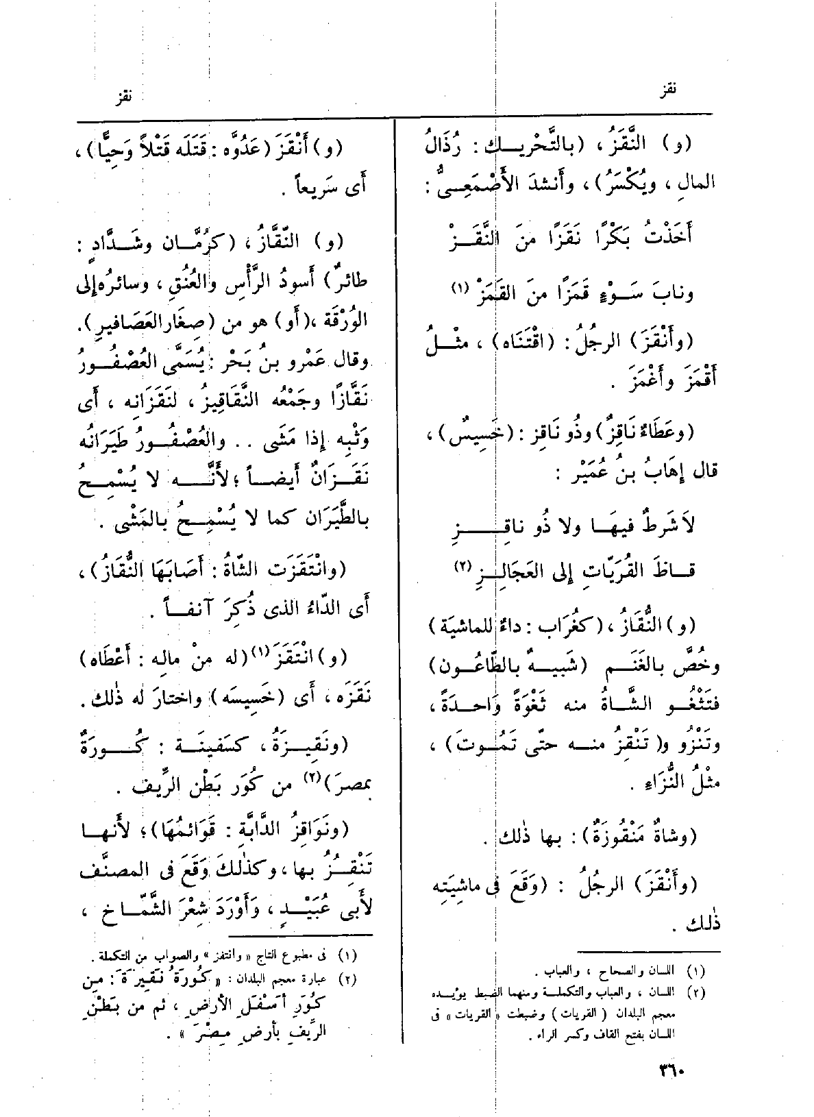 النُّقَاز، كغُراب: داءُ للماشية وخُصَّ بالغنَم شَبيهٌ بالطاعون فتَثْغو الشاةُ مِنْهُ ثَغْوَةً وَاحِدَة وتَنْزُو وتَنْقِزُ مِنْهُ حَتَّى تَمُوت، مثلُ النُّزاءِ. وشاةٌ مَنْقُوزة: بهَا ذَلِك. وأَنْقَزَ الرجلُ: وَقَعَ فِي ماشِيَتِه ذَلِك. أَنْقَزَ عدُوَّه: قَتَلَه قَتْلاً وحِيَّاً، أَي سَرِيعا. النّقَّاز، كرُمّان وشَدَّادٍ: طائرٌ أَسْوَد الرأسِ والعنُق، وسائرُه إِلَى الوُرْقَة، أَو هُوَ من صِغارِ العصافير. وَقَالَ عَمْرُو بنُ بَحْر: يُسمَّى العُصفورُ نَقَّازاً وجَمْعُه النَّقاقيزُ، لنَقَزانِه، أَي وَثْبِه إِذا مَشى ... والعصفورُ طَيَرَانُه نَقَزَانٌ أَيْضا، لأنّه لَا يُسمَحُ)