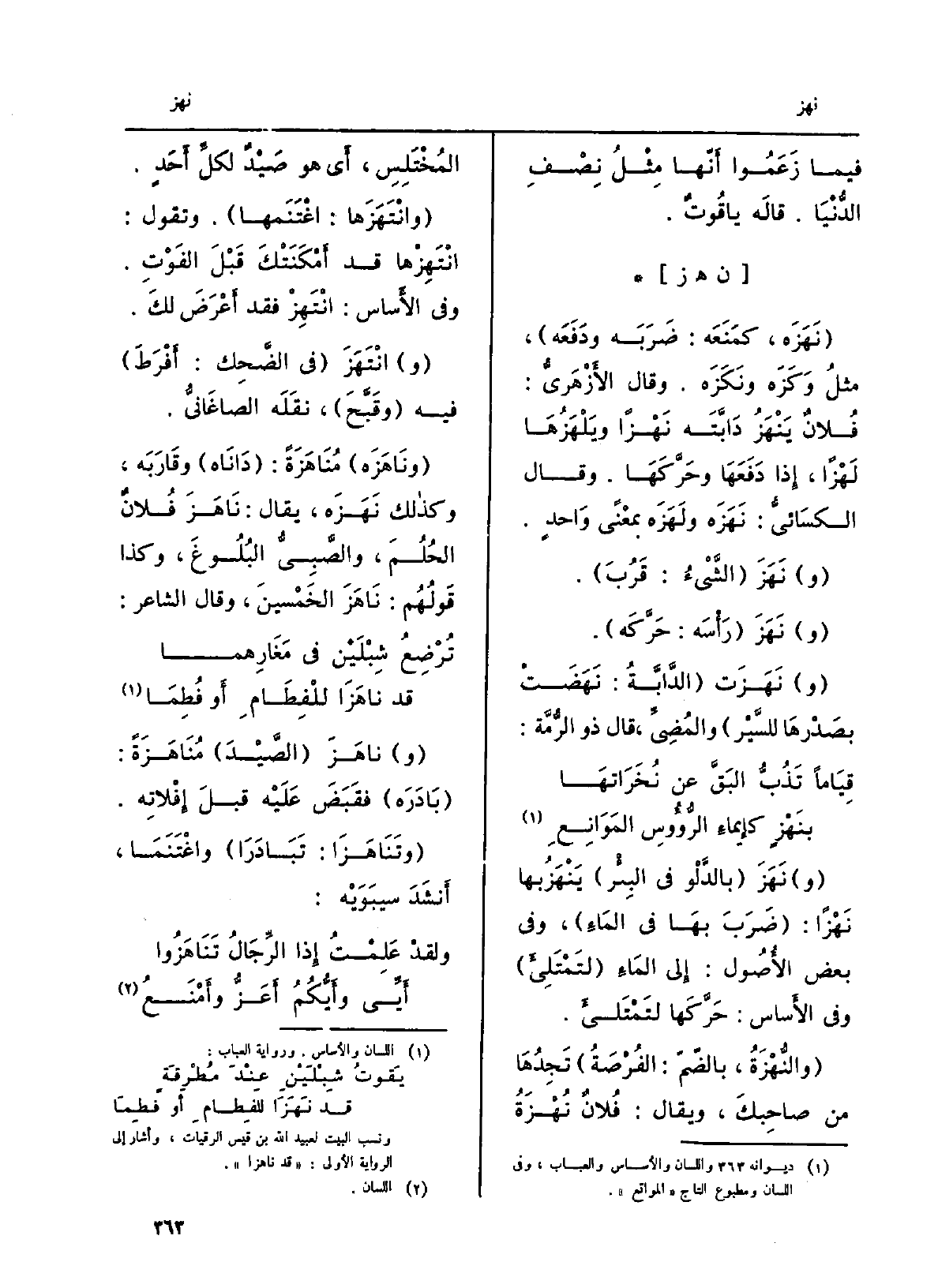 نَهَزَ بالدَّلو فِي الْبِئْر يَنهَزُ بهَا نَهْزاً: ضربَ بهَا فِي الماءِ، وَفِي بعض الأُصول: إِلَى المَاء لتمتلِئَ، وَفِي الأَساس: حرَّكَها لتمتلِئَ. النُّهْزَةُ، بالضَّمّ: الفُرْصَةُ تجِدُها من صاحبِكَ، وَيُقَال: فُلانٌ نُهْزَةُ المُخْتَلِسِ، أَي هُوَ صيدٌ لكلِّ أَحدٍ. وانْتهَزَها: اغْتنمَها. وَتقول: انتَهِزْها قد أَمْكَنَتْكَ قبلَ الفَوْتِ. وَفِي الأَساس: انْتَهَزَ فِي الضَّحِك: أَفْرَط فِيهِ وقبَّحَ، نَقله الصَّاغانِيّ. ناهَزَه مُناهَزَةً: داناهُ وقارَبَه، وَكَذَلِكَ نهزَه، يُقَال: ناهَزَ فُلانٌ الحُلُمَ، والصَّبيُّ البُلوغَ، وَكَذَا قولُهم: ناهَزَ الخمسينَ، وَقَالَ الشاعِر: