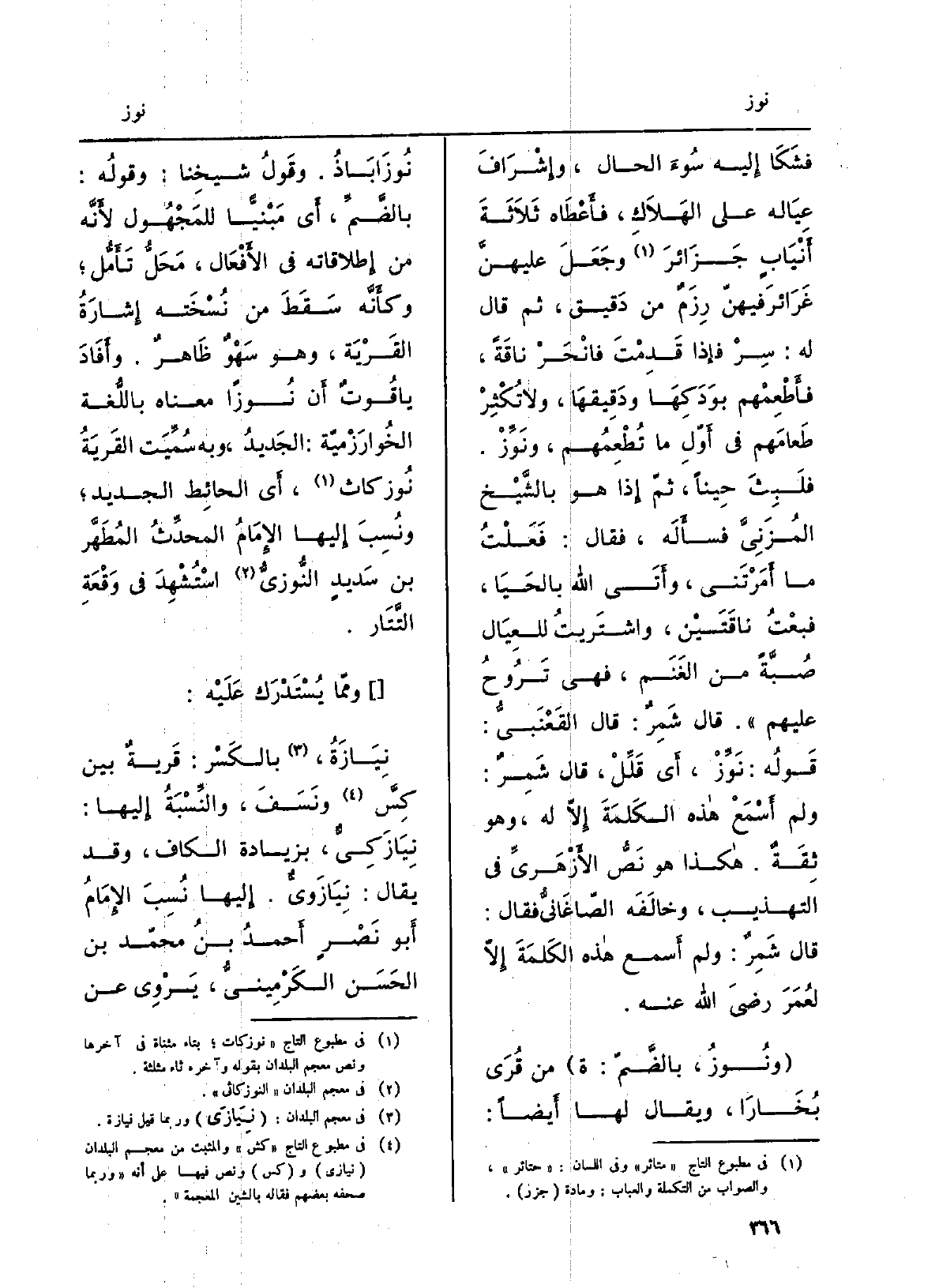 فَشَكا إِلَيْهِ سوءَ الْحَال، وإشرافَ عِيَاله على الهَلاكِ، فأَعطاه ثلاثةَ أَنيابٍ جَزَائِرَ وجعَلَ عليهِنَّ غَرائرَ فيهِنَّ رِزَمٌ من دَقِيق، ثمَّ قَالَ لَهُ: سِرْ فَإِذا قدِمْتَ فانْحَرْ ناقَةً، فأَطْعِمْهُم بوَدَكِها ودَقيقها، وَلَا تُكثِر طعامَهم فِي أَوَّل مَا تُطعِمُهم، {ونَوِّزْ. فلَبِثَ حِيناً، ثمَّ إِذا هُوَ بالشَّيخ المُزَنِيِّ فسأَلَه، فَقَالَ: فعلْتُ مَا أَمرْتَني، وأَتى اللهَ بالحَيا، فبعْتُ ناقَتين، واشتريتُ للعيال صُبَّةً من الغنَم، فَهِيَ تروح عَلَيْهِم. قَالَ شَمِرٌ: قَالَ القَعْنَبِيُّ: قولُه:} نَوِّزْ، أَي قَلِّلْ، قَالَ شَمِرٌ: ولمْ أَسمع هَذِه الْكَلِمَة إلاّ لَهُ، وَهُوَ ثِقَةٌ، هَكَذَا هُوَ نصُّ الأَزْهَرِيّ فِي التَّهْذِيب، وخالفَه الصَّاغانِيّ فَقَالَ: قَالَ شَمِرٌ: وَلم أَسمعْ هَذِه الكلمةَ إلاّ لعُمَرَ رَضِي الله عَنهُ. {ونُوزُ، بالضَّمِّ: ة، من قُرى بُخارَا، وَيُقَال لَهَا أَيضاً:} نُوزَابَاذُ. وَقَول شَيخنَا: وقولُه: بالضَّمِّ، أَي مبنيَّاً للمَجهول لأَنَّه من إطلاقاته فِي الأَفعال، محَلُّ تأَمُّل، وكأَنَّه سقطَ من نسخته إشارةُ الْقرْيَة، وَهُوَ سَهْوٌ ظاهِرٌ، وأَفادَ ياقوتٌ أَنَّ {نُوزاً مَعْنَاهُ باللُّغة الخُوارَزْمِيَّة: الجَديد، وَبِه سُمِّيَت القَريَةُ} نُوز كاث، أَي الْحَائِط الْجَدِيد، ونُسِب إِلَيْهَا الإِمَام المُحَدِّثُ المُطَهَّر بن سَديدٍ {- النُّوزِيُّ اسْتُشْهِدَ فِي وَقعة التَّتار. ومِمّا يُستدرَك عَلَيْهِ:} نِيازَةُ، بالكسْر: قَريةٌ بَين كسَّ ونَسَفَ، والنِّسْبَةُ إِلَيْهَا: {- نِيازَكِيٌّ، بزيادَة الْكَاف، وَقد يُقال:} - نِيازَوِيٌّ، إِلَيْهَا نُسِبَ الإمامُ أَبو نَصْرٍ أَحمدُ بن مُحَمَّد بن الحسَن الكَرْمِينيُّ، يَروِي عَن