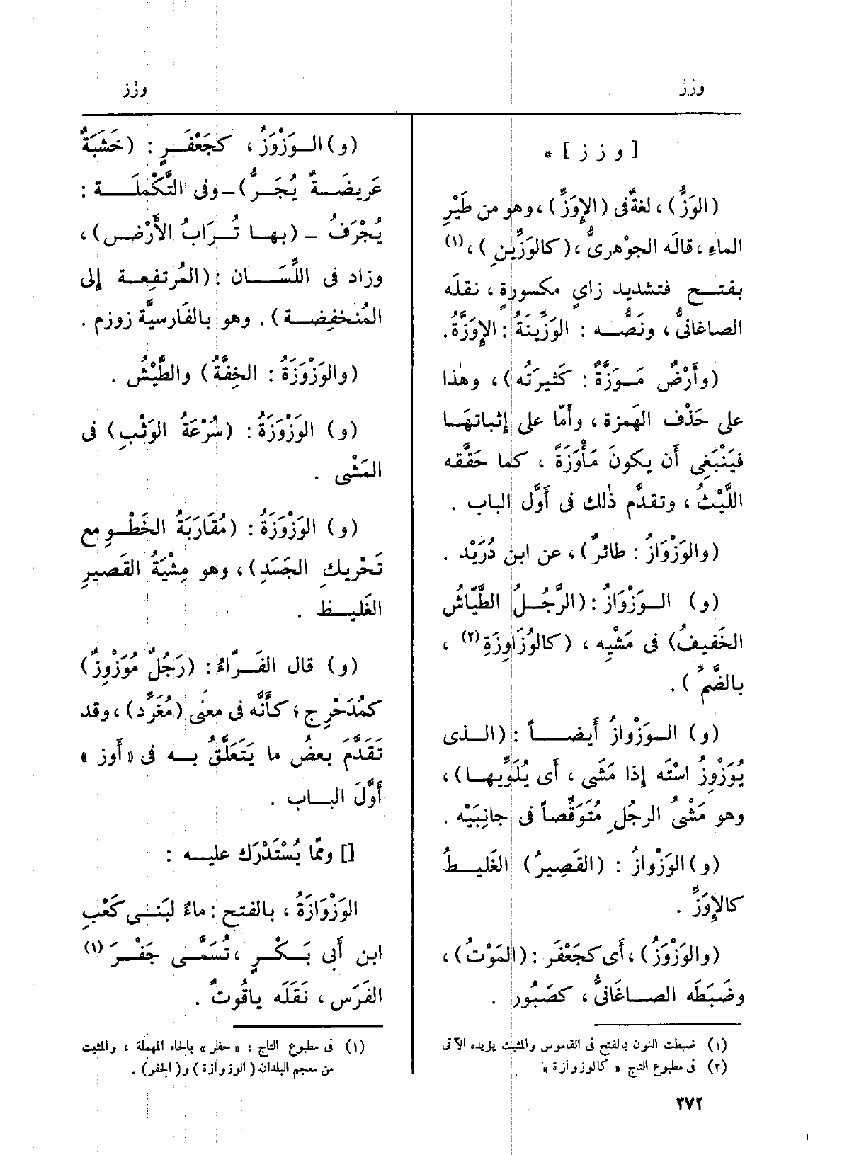 } والوَزْوَازُ: الرَّجُل الطَّيَّاشُ الخفيفُ فِي مَشيِه، {كالوُزاوِزَةِ، بالضَّمّ.} الوَزْوازُ أَيضاً: الَّذِي {يُوَزْوِزُ اسْتَه إِذا مَشى، أَي يُلَوِّيها، وَهُوَ مَشْيُ الرَّجُلِ مُتَوَقِّصاً فِي جانبيه.} الوَزْوازُ: القصيرُ الغَليظُ كالإوَزِّ. {والوَزْوَزُ، أَي كجَعْفَر: المَوْتُ، وضبطَه الصَّاغانِيّ، كصَبور.} الوَزْوَزُ، كجَعْفرٍ: خشَبَةٌ عريضَةٌ يُجَرُّ، وَفِي التكملة، بُجرَفُ بهَا تُرَاب الأَرْض، وَزَاد فِي اللِّسَان: المُرتفعة إِلَى المنخفضة، وَهُوَ بالفارسيَّة زوزم. {والوَزْوَزَةُ: الخِفَّة والطَّيشُ.} الوَزْوَزَةُ: سُرْعَة الوَثْبِ فِي المَشْيِ. {الوَزْوَزَةُ: مُقارَبَة الخَطْوِ مَعَ تَحْرِيك الجَسَدِ، وَهُوَ مِشيَةُ الْقصير الغليظ. قَالَ الفرَّاءُ: رَجُلٌ} مُوَزْوِزٌ، كمُدَحرِج، كَأَنَّهُ فِي معنى مُغَرِّد. وَقد تقدّم بعضُ مَا يتعلَّق بِهِ فِي أَوز أَوَّل الْبَاب. وَمِمَّا يُستدرك عَلَيْهِ:! الوَزْوازَةُ: بِالْفَتْح: ماءٌ لبني كَعْبِ بن أبي بَكْرٍ، تُسَمَّى جَفْرَ الفَرَس، نَقله ياقوتٌ.