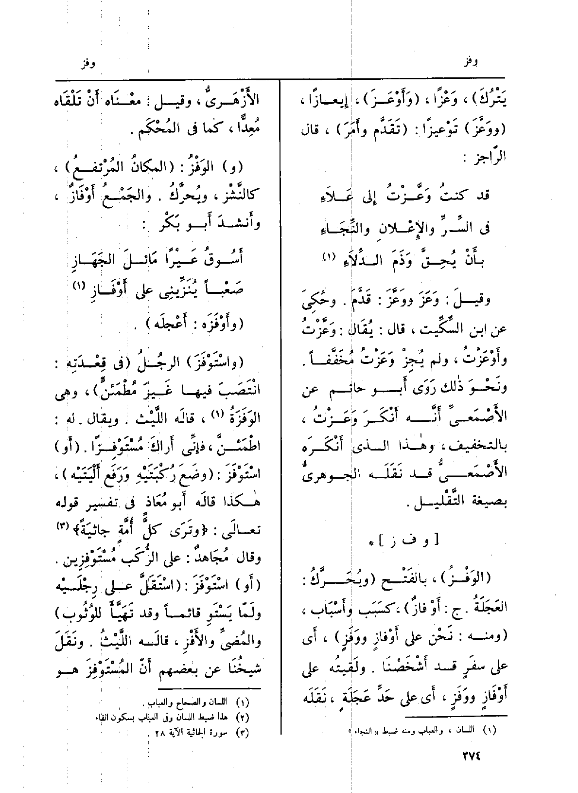 } وأَوفَزَه: أَعْجلَه. {واسْتَوْفَزَ الرَّجلُ فِي قِعْدَتِه: انْتَصَبَ فِيهَا غيرَ مُطمَئِنٍّ، وَهِي} الوَفَزَةُ، قَالَه اللَّيْث. وَيُقَال لَهُ: اطْمَئنَّ، فإنِّي أَراكَ {مُسْتَوْفِزاً.} استَوْفَزَ: وضَعَ رُكْبَتَيْهِ ورفَعَ أَلْيَتَيْه، هَكَذَا قَالَه أَبو مُعاذٍ فِي تَفْسِير قَوْله تَعَالَى: وتَرَى كُلَّ أُمَّةٍ جاثِيَةً. وَقَالَ مُجاهِدٌ: على الرُّكَبِ مُسْتَوْفِزينَ.