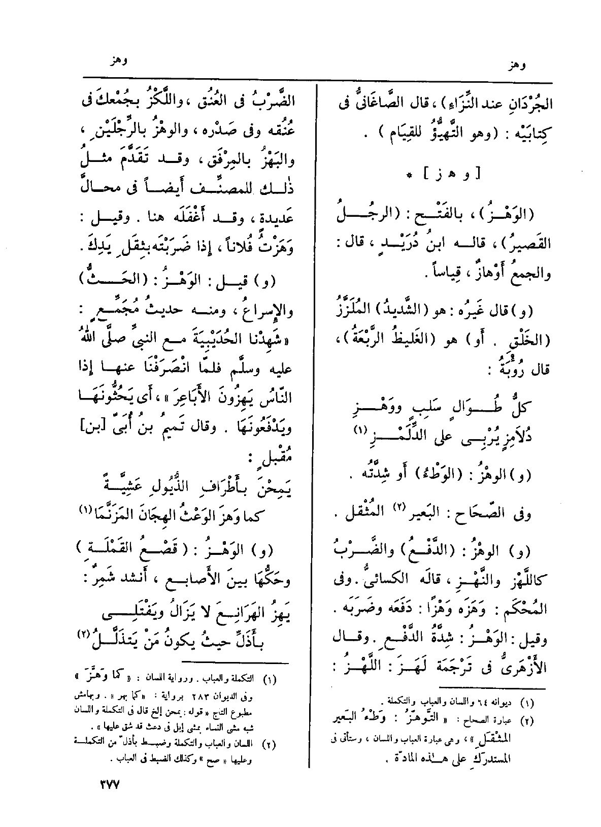 الوَهْزُ: الوَطْءُ أَو شِدَّتُه. وَفِي الصِّحاح: البَعير المُقل. الوَهْزُ: الدَّفْعُ والضَّرْبُ كاللَّهْزِ والنَّهْزِ، قَالَه الكِسائِيُّ، وَفِي المُحكَم:} وهَزَهُ {وَهْزاً: دفعَه وضربَه. وَقيل:} الوَهْزُ: شِدَّة الدَّفع. وَقَالَ الأَزْهَرِيُّ فِي تَرجمَة لَهَزَ: اللَّهْزُ: الضَّرْبُ فِي العُنُق، واللَّكْزُ بجُمْعِكَ فِي عُنُقه وَفِي صَدره، {والوَهْزُ بالرِّجلَيْن، والبَهْزُ بالمِرْفَقِ، وَقد تقدَّم مثلُ ذَلِك للمصنِّف أَيضاً فِي محالَّ عديدةٍ، وَقد أَغفلَه هُنَا. وَقيل:} وَهَزْتُ فلَانا، إِذا ضرَبْتَه بثِقَلِ يَدِكَ. قيل: الوَهْزُ: الحَثُّ والإسراعُ، وَمِنْه حَدِيث مُجَمِّعٍ: شَهِدنا الحُديبيةَ مَعَ النبيِّ صلّى الله عَلَيْهِ وسلَّم فلمّا انصرَفْنا عَنْهَا إِذا الناسُ {يَهِزُونَ الأَباعِرَ، أَي يَحُثُّونَها ويَدفعونَها. وَقَالَ تميمُ بنُ أُبَيّ بن مُقْبِلٍ: