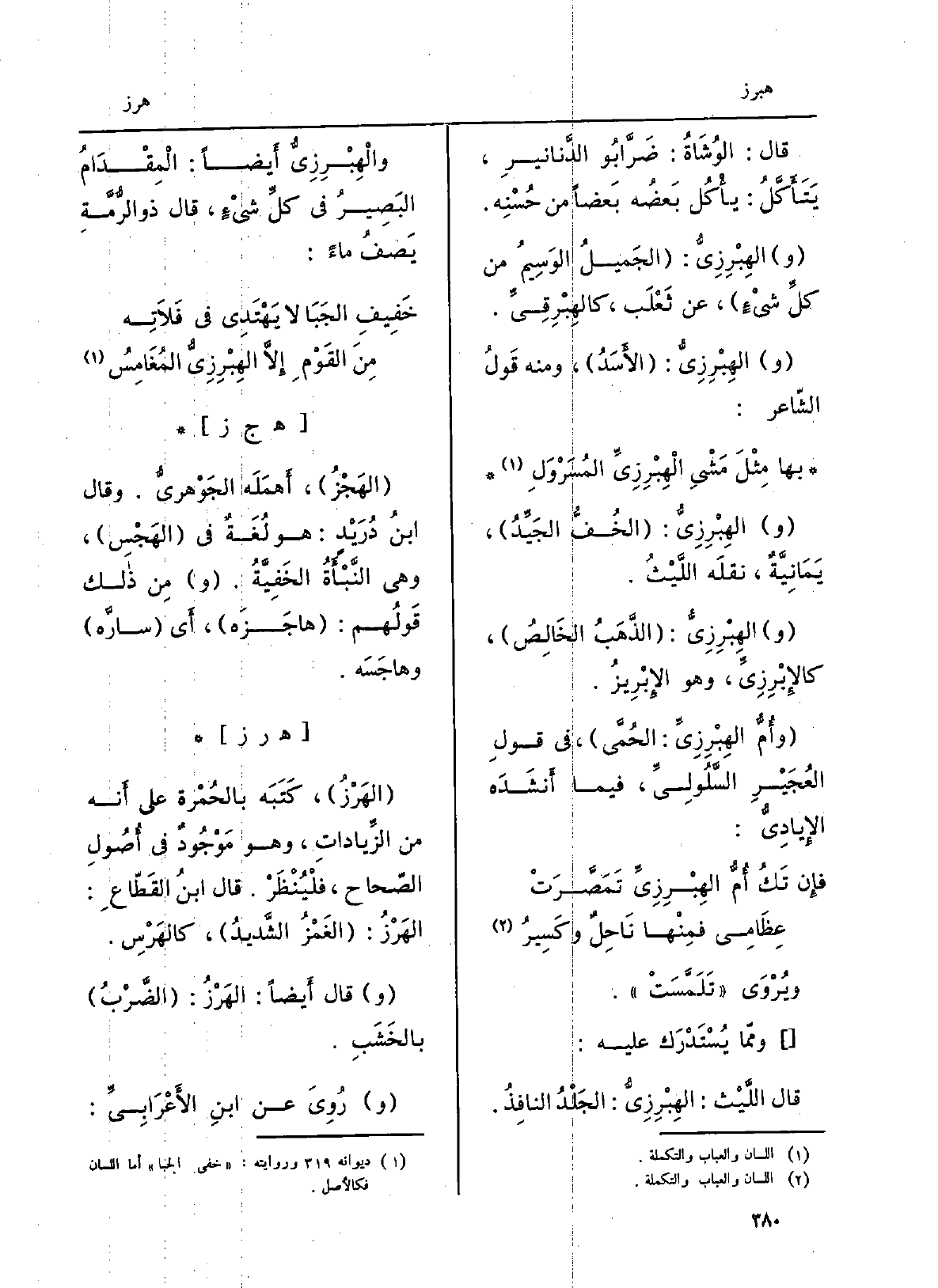 قَالَ: الوُشاة: ضَرَّابو الدَّنانير، يَتَأَكَّل: يأكلُ بَعْضُه بَعْضًا من حُسنِه. الهِبْرِزِيُّ: الجميلُ الوسيمُ من كل شيءٍ، عَن ثَعْلَب، كالهِبْرِقِيّ. الهِبْرِزِيُّ: الأسَدُ، وَمِنْه قَول الشَّاعِر: بهَا مِثلَ مَشْيِ الهِبْرِزِيِّ المُسَرْوَلِ الهِبْرِزِيُّ: الخُفُّ الجَيِّد، يمانِيَّةٌ، نَقله الليثُ. الهِبْرِزِيُّ: الذَّهَبُ الخالِص، كالإبْرِزِيّ، وَهُوَ الإبْريز. وأُمُّ الهِبْرِزِيُّ: الحُمَّى، من قولِ العُجَيْرِ السَّلُوليِّ، فِيمَا أنْشدهُ الإياديُّ: