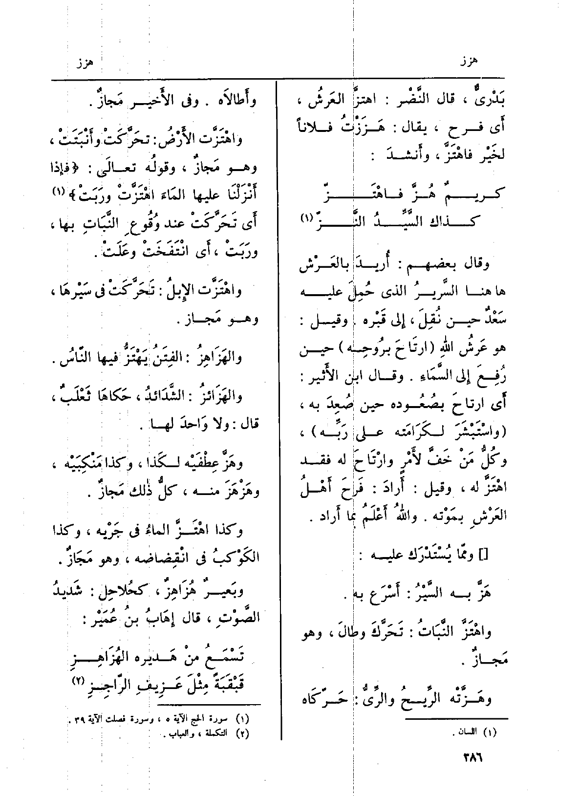 {واهْتَزَّت الأرضُ: تحرَّكَتْ وأَنْبَتتْ، وَهُوَ مَجاز، وقَوْله تَعالى: فَإِذا أَنْزَلنا عَلَيْهَا الماءَ} اهْتَزَّتْ ورَبَتْ أَي تحرَّكَتْ عِنْد وُقوعِ النباتِ بهَا، ورَبَتْ، أَي انْتفخَتْ وعلَتْ. {واهْتَزَّتْ الإبلُ: تحرَّكَتْ فِي سَيْرِها، وَهُوَ مَجاز.} والهَزَاهِز: الفِتَنُ يَهْتَزُّ فِيهَا النّاسُ. {والهَزائِز: الشَّدائد، حَكَاهَا ثعلبٌ، قَالَ: وَلَا واحدَ لَهَا.} وهَزَّ عِطْفَيْه لكذا، وَكَذَا مَنْكَبَيْه، {وهَزْهَزَ مِنْهُ، كلُّ ذَلِك مَجاز. وَكَذَا} اهْتَزَّ الماءُ فِي جَرْيِه، وَكَذَا الكَوكبُ فِي انْقِضاضه، وَهُوَ مَجاز. وبَعيرٌ {هُزاهِزٌ، كحُلاحِل: شديدُ الصَّوتِ، قَالَ إهابُ بنُ عُمَيْر: