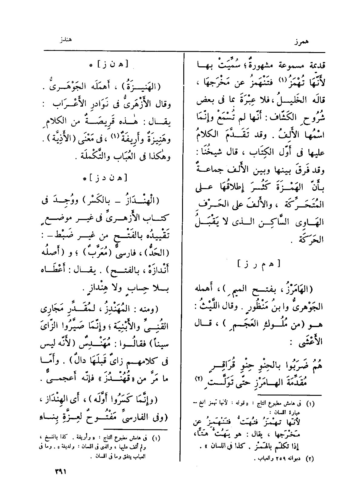 الهنْداز بالكَسْر ووُجِدَ فِي كتاب الأَزْهَرِيّ فِي غيرِ موضعٍ تَقْيِيدُه بالفَتْح من غيرِ ضبطٍ: الحَدُّ، فارسيٌّ مُعرَّبٌ وأصلُه أندازَهْ، بالفَتْح. يُقَال: أعطَاهُ بِلَا حِسابٍ وَلَا هِنْدازٍ. وَمِنْه: المُهَنْدِز، لمُقَدِّرِ مَجاري القُنِيِّ والأبنية، وإنّما صيَّروا الزايَ سيناً فَقَالُوا: مُهَنْدِسٌ لأنّه لَيْسَ فِي كَلَامهم زايٌ قبلهَا دالٌ. وأمّا مَا مَرَّ من قُهُنْدُزَ فإنّه أعجميٌّ. وإنّما كسروا أوّلَه، أَي الهِنْداز، وَفِي الفارسيِّ مَفْتُوحٌ لعِزَّةِ بِنَاء