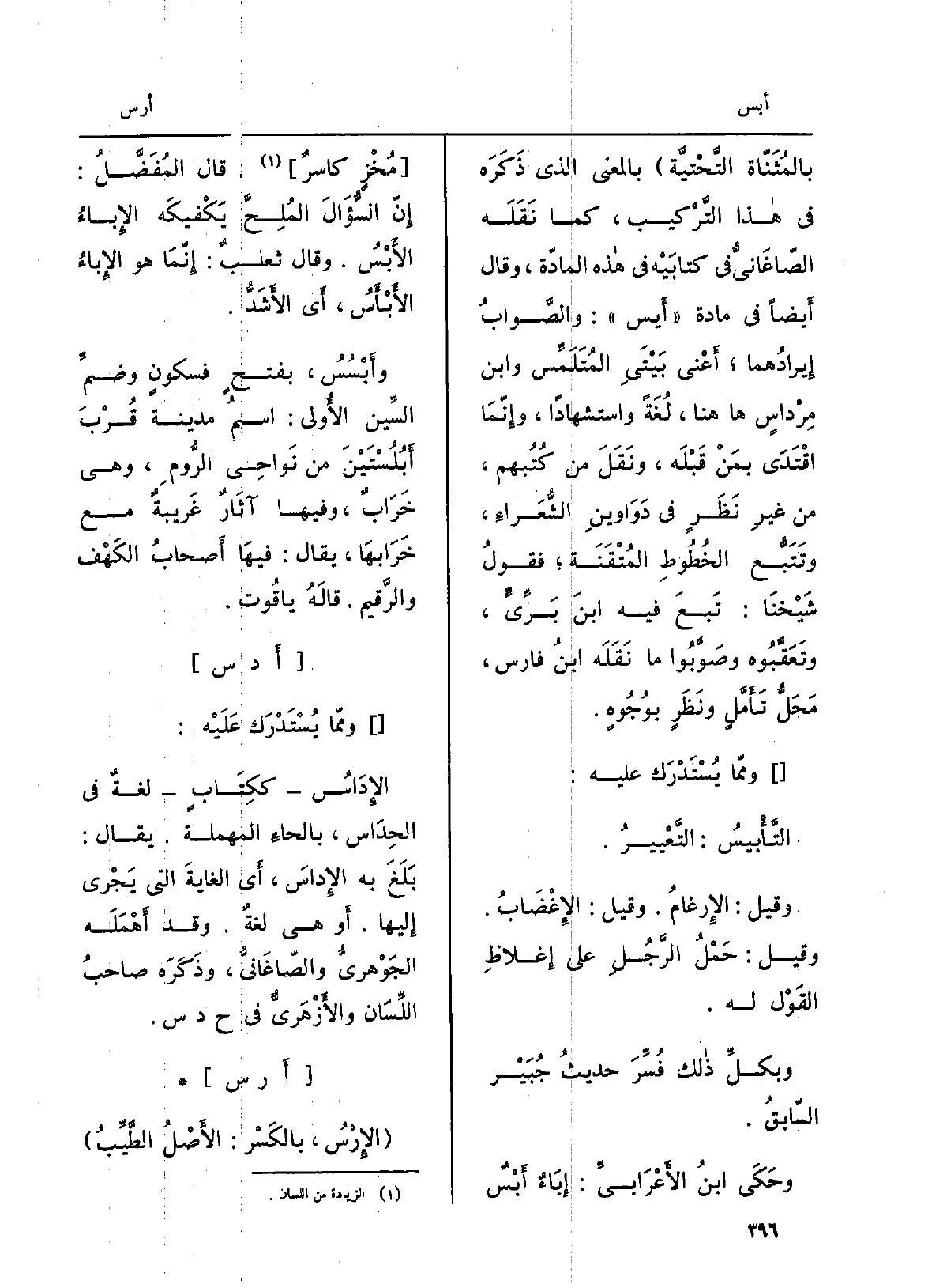 َ بالمُثَنّاة التحتيّة بِالْمَعْنَى الَّذِي ذكره فِي هَذَا التَّرْكِيب، كَمَا نَقله الصَّاغانِيّ فِي كتابَيْه فِي هَذِه الْمَادَّة، وَقَالَ أَيْضا فِي مَادَّة أيس: والصوابُ إيرادُهما أَعنِي بَيْتَيِ المُتَلَمِّس وابنِ مِرْداسٍ هَا هُنَا، لُغَة واستِشهاداً، وإنّما اقْتدى بمَن قبلَه، ونقلَ من كتُبهم، من غيرِ نظَرٍ فِي دواوينِ الشُّعراءِ، وتَتَبُّع الخُطوطِ المُتقَنَة فقولُ شَيخنَا: تبعَ فِيهِ ابنَ بَرِّيٍّ، وتَعَقَّبوه وصوَّبوا مَا نَقله ابنُ فَارس، مَحَلُّ تأَمُّلٍ وَنَظَرٍ بوُجوهٍ. ومِمّا يُسْتَدْرَك عَلَيْهِ: {التَّأْبيس: التَّعْيير. وَقيل: الإرْغام. وَقيل: الإغْضاب. وَقيل: حَمْلُ الرجلِ على إغْلاظِ القَول لَهُ. وبكلِّ ذَلِك فُسِّر حديثُ جُبَيْر السَّابِق. وَحكى ابْن الأَعْرابِيّ: إباءٌ} أَبْسٌ مُخْزٍ كاسرٌ. قَالَ المُفَضَّل: إنّ السؤالَ المُلِحَّ يَكْفيكَه الإباءُ الأَبْسُ. وَقَالَ ثعلبٌ: إنّما هُوَ الإباءُ الأَبْأَس، أَي الأَشَدّ. {وأَبْسُسُ، بفتحٍ فسكونٍ وضمِّ السينِ الأُولى: اسمُ مدينةٍ قربَ أَبْلُسْتَيْنَ من نواحي الرُّوم، وَهِي خَرابٌ، وفيهَا آثارٌ غَريبةٌ مَعَ خَرابِها، يُقَال: فِيهَا أصحابُ الكهفِ والرَّقيم، قَالَه ياقوت.