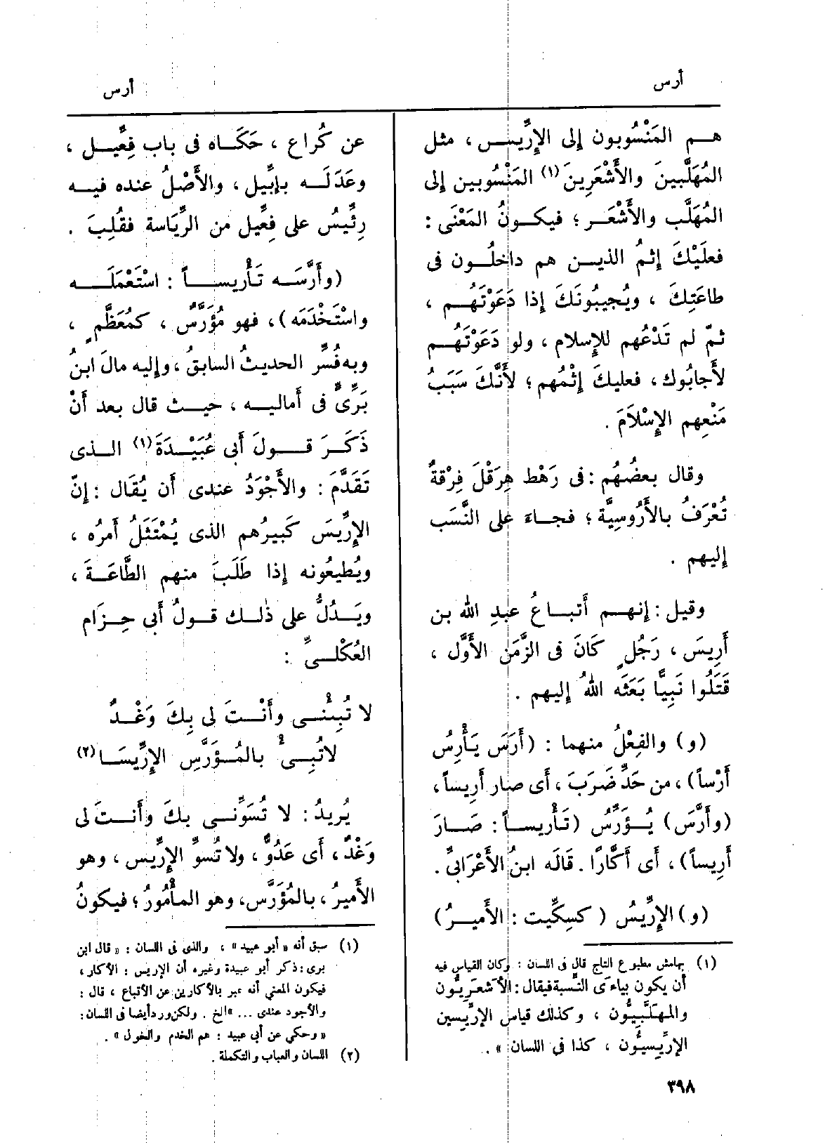 هم المَنسوبونَ إِلَى {الإِرِّيس، مثل المُهَلَّبينَ والأَشْعَرِينَ المنسوبين إِلَى المُهَلَّب والأَشْعَر، فَيكون الْمَعْنى: فَعَلَيْك إثْمُ الَّذين هم داخِلونَ فِي طاعتِكَ، ويُجيبونَكَ إِذا دعَوْتَهُم، ثمَّ لمْ تَدْعُهُم لِلْإِسْلَامِ، وَلَو دعَوْتَهُم لأَجابوك، فعليكَ إثْمُهُم، لأَنَّكَ سَبَبُ مَنْعِهِم الإسلامَ. وَقَالَ بعضُهم: فِي رَهْطِ هِرَقْلَ فِرْقَةٌ تُعرَفُ} بالأَرُوسِيَّة، فجاءَ على النَّسَبِ إليهِم. وَقيل: إنَّهم أَتباعُ عَبْد الله بن أَرِيسَ، رَجُلٍ كَانَ فِي الزَّمَن الأَوَّل، قتلوا نبيَّاً بَعثه الله إِلَيْهِم. والفِعْلُ منهُما: أَرَسَ يَأْرِسُ أَرْساً، من حَدِّ ضرَبَ، أَي صارَ {أَرِيساً،} وأَرَّسَ {يُؤَرِّسُ} تَأْرِيساً: صارَ {أَرِيساً، أَي أَكّاراً. قَالَه ابنُ الأَعرابيِّ.} الإِرِّيسُ كسِكِّيت: الأَميرُ، عَن كُراع، حكاهُ فِي بَاب فِعِّيل، وعَدَلَه بإبِّيل، والأَصل عِنْده فِيهِ رِئِّيسُ على فِعِّيل من الرِّياسَةِ فقُلِبَ. {وأَرَّسَه) } تَأْرِيساً: استعملَه واسْتَخْدَمَه، فَهُوَ {مُؤَرَّسٌ، كمُعَظَّمٍ، وَبِه فُسِّرَ الحَدِيث السَّابق، وَإِلَيْهِ مَال ابنُ بَرِّيّ فِي أَماليه، حَيْثُ قَالَ بعد أَنْ ذَكَر قولَ أَبي عُبَيْدَة الَّذِي تقدَّمَ: والأَجْوَدُ عِنْدِي أَن يُقال: إنَّ} الإرِّيسَ كبيرُهُم الَّذِي يُمْتَثَلُ أَمْرُه، ويُطيعونَه إِذا طلَبَ منهمُ الطَّاعةَ، ويَدُلُّ على ذَلِك قولُ أَبي حزَام العُكْلِيِّ: