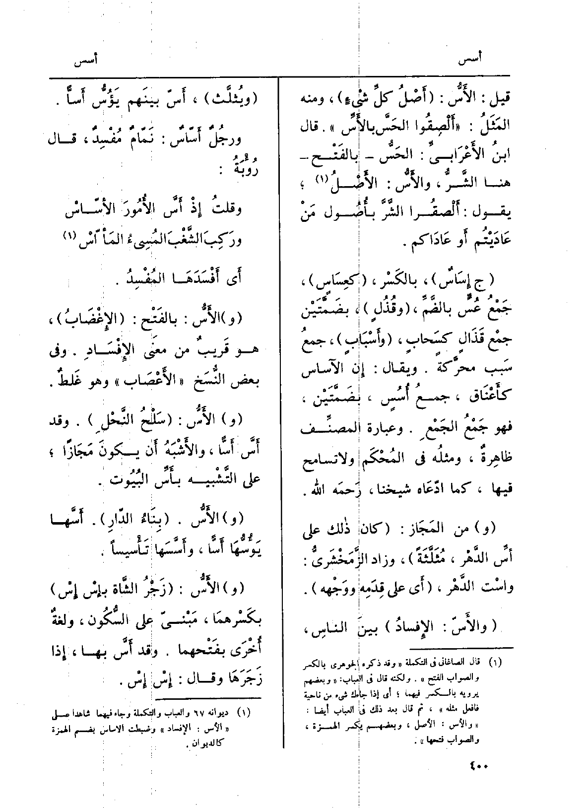 قَالَ ابْن الأَعرابيِّ: الحَسُّ، بِالْفَتْح، هُنَا الشَّرُّ، {والأَسُّ: الأَصْلُ، يَقُول: أَلْصقُوا الشَّرَّ بأُصول مَن عادَيْتُم أَو عاداكُم. ج} إسَاسٌ، بالكسْر، كعِساسٍ، جمع عُسٍّ، بالضَّمِّ، وقُذُلٍ، بضَمَّتين جمْع قَذالٍ كسَحابٍ، وأَسبابٍ، جمع سبَب محرَّكةً. وَيُقَال: إنَّ الآساس كأَعناق، جمع {أُسُسٍ، بضمَّتين، فَهُوَ جَمع الجَمعِ. وعِبارَة المُصنِّف ظاهرَةٌ، ومثلُه فِي المُحكَم وَلَا تسامُح فِيهَا، كَمَا ادَّعاه شيخُنا، رَحمَه الله. منَ المَجاز: كَانَ ذَلِك على} أسِّ الدَّهر، مثلَّثةً، وَزَاد الزّمخشريُّ: واسْت الدَهْر، أَي على قِدَمه ووَجهه. {والأَسّ: الإفسادُ بَين النَّاس، ويُثَلَّث،} أَسَّ بينَهم {يؤُسُّ} أَسَّاً. ورجلٌ {أَسَّاسٌ: نَمَّامٌ مُفسِدٌ، قَالَ رُؤبة: