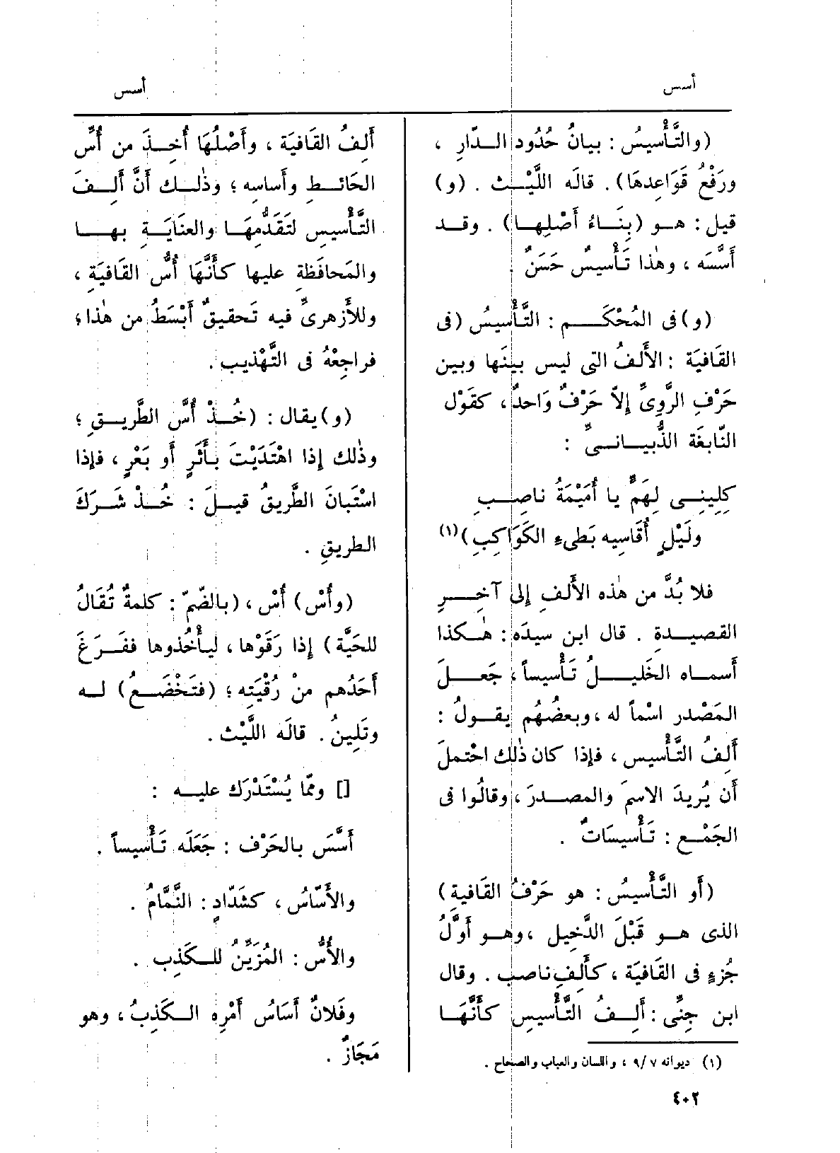 فَلَا بدَّ من هَذِه الأَلف إِلَى آخِرِ القصيدة. قَالَ ابْن سِيدَه: هَكَذَا أَسْماه الخليلُ تأْسيساً، جعلَ المَصدرَ اسْماً لَهُ، وبعضُهم يَقُول: أَلِفُ {التَّأْسيسِ، فَإِذا كَانَ ذلكَ احْتَمَلَ أَن يُريدَ الاسمَ والمَصدرَ، وَقَالُوا فِي الجَمع:} تأْسيساتٌ. أَو التَّأْسيسُ: هُوَ حَرفُ القافيةِ الَّذِي هُوَ قبل الدَّخيل، وَهُوَ أَوَّل جُزءٍ فِي القافية، كأَلِفِ ناصِبِ. وَقَالَ ابْن جِنِّي: أَلِفُ التَّأْسيس كأَنَّها أَلِفُ القافية، وأَصلُها أُخِذَ من أُسِّ الحائطِ وأَساسِه، وَذَلِكَ أَنَّ أَلِفَ التَّأْسيس لتَقَدُّمِها والعناية بهَا والمُحافظَة عَلَيْهَا كأَنَّها أُسُّ القافية، وللأزهريِّ فِيهِ تحقيقٌ أَبْسَطُ من هَذَا، فراجِعْه فِي التَّهْذِيب. يُقال: خُذْ أُسَّ الطَّريقِ، وَذَلِكَ إِذا اهْتَديتَ بأَثَرٍ أَو بَعْرٍ، فَإِذا اسْتَبانَ الطّريقُ قيل: خُذْ شَرَكَ الطَّريقِ. {أُسْ} أُسْ بالضَّمّ: كلمةٌ تُقال للحَيَّة إِذا رَقَوْها، ليَأْخُذوها ففَرَغَ أَحدُهم من رُقْيَتِه، فتخضَعُ لَهُ وتلينُ.