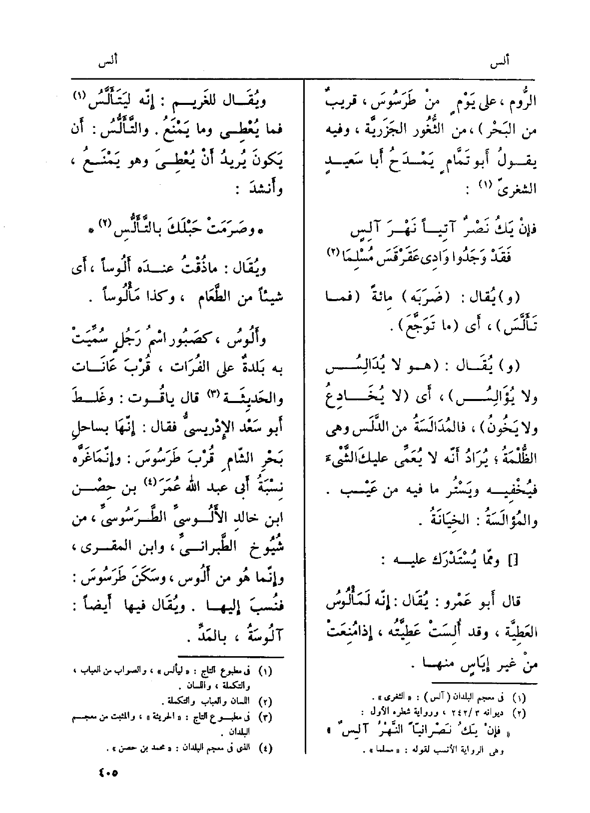 يُقال: ضرَبَه مائَةً فَمَا} تَأَلَّسَ، أَي مَا تَوَجَّعَ. يُقال: هُوَ لَا يُدالِسُ وَلَا {يُؤَالِسُ، أَي لَا يُخادِع وَلَا يَخونُ، فالمُدالَسَةُ من الدَّلَسِ وَهِي الظُّلْمَةُ، يُرادُ أَنَّه لَا يُعَمِّي عليكَ الشيءَ فيُخفيه ويَسْتُر مَا فِيهِ من عيب.} والمُؤالَسَةُ: الخِيانَةُ. وَمِمَّا يُستدرَك عَلَيْهِ: قَالَ أَبو عَمرو: يُقال: إنَّه {لمَأْلُوسُ العَطِّيَّة، وَقد} أُلِسَتْ عَطِيَّتُه، إِذا مُنِعَتْ من غيرِ إياسٍ مِنْهَا. ويُقال للْغَرِيم: إنَّه {ليتَأَلَّسُ فَمَا يُعطِي وَمَا يَمْنَعُ.} والتَّأَلُّسُ: أَن يكونَ يُريد أَن يُعطِيَ وَهُوَ يَمْنَعُ، وأَنشدَ: وصَرَمَتْ حَبْلَكَ {بالتَّأَلُّسِ ويُقال: مَا ذُقْتُ عِنْده} أَلُوساً، أَي شَيْئا من الطَّعام، وَكَذَا {مَأْلُوساً.} وأَلُوسُ، كصَبور اسْم رجلٍ سُمِّيَتْ بِهِ بلدةٌ على الْفُرَات، قُرْبَ عانات والحَديثة، قَالَ ياقوت: وغَلطَ أَبُو سعد الإدريسيُّ فَقَالَ: إنَّها بساحِل بَحر الشَّام قرب طَرْسوس، وإنَّما غَرَّه نِسبةُ أَبي عبد الله عمر بن حِصْن بن خَالِد {- الأَلوسيِّ الطَّرسوسيِّ، من شُيُوخ الطَّبرانِيِّ، وَابْن الْمقري، وإنَّما هُوَ من أَلُوس، وسكَنَ طَرسُوسَ: فنُسِبَ إِلَيْهَا. وَيُقَال فِيهَا أَيضاً:} آلُوسَةُ، بالمَدِّ.