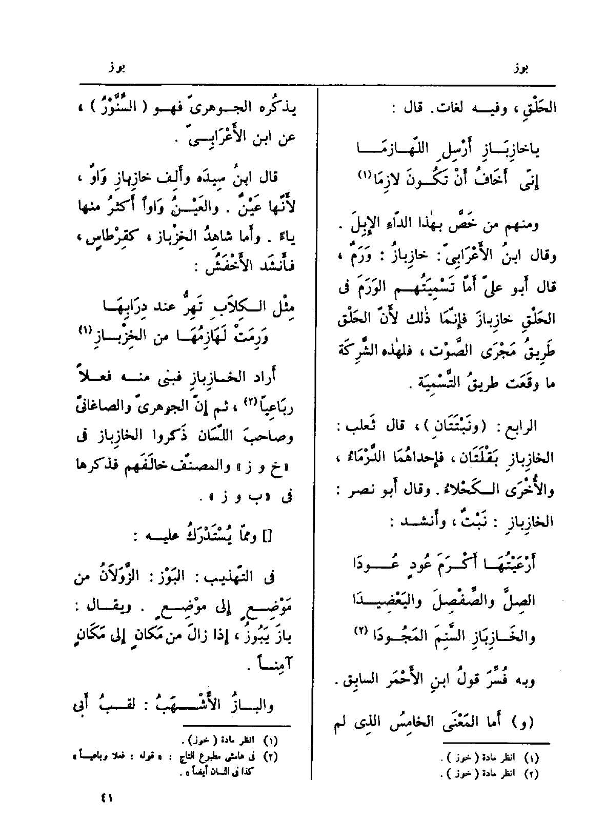 والخازِبازِ السَّنِمَ المَجُودا وَبِه فُسِّرَ قَوْلُ ابنِ الأحمرِ السَّابِق. أما الْمَعْنى الخامسُ الَّذِي لم يذكرهُ الجَوْهَرِيّ فَهُوَ السِّنَّوْر، عَن ابْن الأَعْرابِيّ. قَالَ ابنُ سِيدَه وأَلِفُ خازِبازِ واوٌ، لأنّها عَيْنٌ. والعَينُ واواً أكثرُ مِنْهَا يَاء.