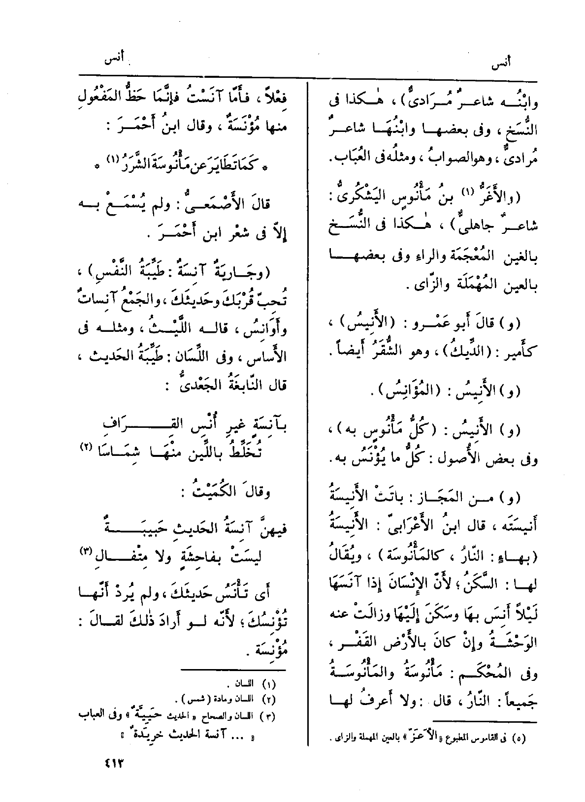 الأَنيس: كلُّ {مأَنوسٍ بِهِ، وَفِي بعض الْأُصُول: كلُّ مَا يُؤْنَس بِهِ. منَ المَجاز: باتَتْ الأَنيسَةُ أَنيستَه، قَالَ ابْن الأَعْرابِيّ:} الأَنيسةُ بهاءٍ: النَّار، {كالمَأْنُوسَة، وَيُقَال لَهَا: السَّكَن لأنّ الإنسانَ إِذا} آنَسَها لَيْلاً {أَنِسَ بهَا وسَكَنَ إِلَيْهَا وزالَت عَنهُ الوَحْشَةُ وإنْ كَانَ بالأرَض القَفر، وَفِي المُحكَم:) } مَأْنُوسةُ {والمَأْنوسة جَمِيعًا: النَّار، قَالَ: وَلَا أعرفُ لَهَا فِعلاً، فأمّا} آنَسْتُ فإنّما حَظُّ المَفْعولِ مِنْهَا {مُؤْنَسَةٌ، وَقَالَ ابنُ أَحْمَرَ: كَمَا تَطايَرَ عَن} مَأْنُوسَةَ الشَّرَرُ قَالَ الأَصْمَعِيّ: وَلم يُسمَعْ بِهِ إلاّ فِي شِعر ابْن أَحْمَر. وجارِيَةٌ {آنِسَةٌ: طَيِّبَةُ النَّفس، تُحِبُّ قُربَكَ وحديثَك، والجَمعُ} آنِساتٌ {وأوانِس، قَالَه اللَّيْث، وَمثله فِي الأساس، وَفِي اللِّسان: طَيِّبَةُ الحَدِيث، قَالَ النابغةُ الجَعْديُّ: