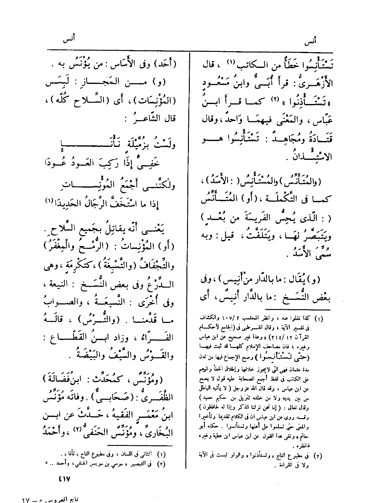 {تَسْتَأْنِسوا خطأٌ من الْكَاتِب، قَالَ الأَزْهَرِيّ: قرأَ أُبَيٌّ وابنُ مسعودٍ تستأْذِنوا كَمَا قَرَأَ ابنُ عبّاس، وَالْمعْنَى فيهمَا واحدٌ، وَقَالَ قَتادَةُ ومُجاهِدٌ: تَسْتَأْنِسوا هُوَ الاسْتِئْذان.} والمُتَأَنِّسُ {والمُسْتَأْنِس: الأَسَد، كَمَا فِي التكملة، أَو} المُتَأَنِّسُ: الَّذِي يُحِسُّ الفَريسةَ من بُعدٍ وَيَتَبصَّرُ لَهَا، وَيَتَلفَّت، قيل: وَبِه سُمِّيَ الأسَدُ. يُقَال: مَا بِالدَّار من {أَنيسٌ، وَفِي بعضِ النُّسَخ: مَا بالدارِ أَنيسٌ، أَي أحد، وَفِي الأساس: من} يُؤْنَسُ بِهِ. منَ المَجاز: لَبِسَ {المُؤْنِسات، أَي السِّلاحَ كلّه، قَالَ الشَّاعِر: