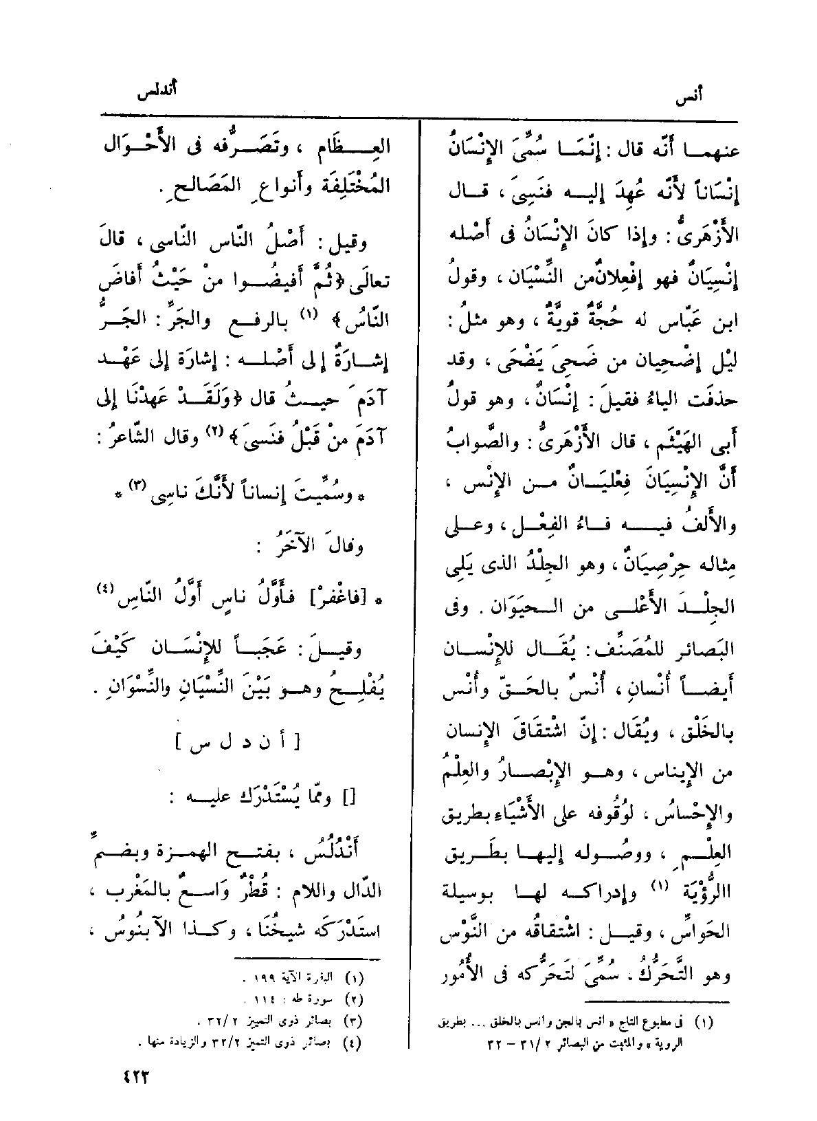 وَقيل: أصلُ النَّاس النّاسي، قَالَ تَعَالَى: ثمّ أَفيضوا من حَيْثُ أَفاضَ النّاسُ بالرفعِ والجَرِّ: الجَرُّ إشارةٌ إِلَى أَصله: إشارةٌ إِلَى عهد آدمَ حيثُ قَالَ: ولقدْ عَهِدْنا إِلَى آدَمَ من قَبْلُ فنَسِيَ وَقَالَ الشَّاعِر: وسُمِّيتَ} إنْساناً لأنّكَ ناسي وَقَالَ الآخَر: فاغْفِرْ فأوَّلُ ناسٍ أوَّلُ النّاسِ وَقيل: عَجَبَاً للإنْسانِ كيفَ يُفلِحُ وَهُوَ بَيْنَ النِّسْيان والنِّسْوان.
