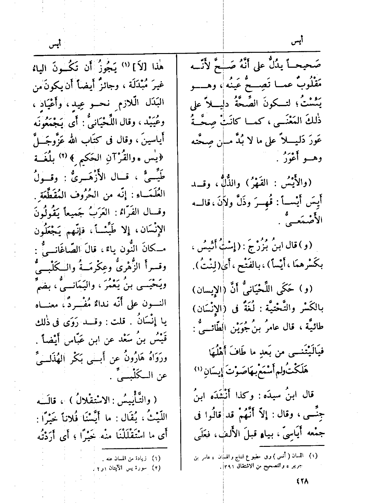 قَالَ ابنُ سِيدَه: وَكَذَا أنْشدهُ ابنُ جنِّي، وَقَالَ: إلاّ أنّهم قد قَالُوا فِي جمعه \ {- أياسِيّ، بياءٍ قبل الْألف، فعلى هَذَا لَا يجوز أَن تكون الياءُ غيرَ مُبدَلة، وجائزٌ أَيْضا أَن يكون البدَلُ اللازمِ نَحْو عِيدٍ، وأَعْيَادٍ، وعُيَيْد، وَقَالَ اللِّحْيانيّ: أَي يَجْمَعونَه أياسين، وَقَالَ فِي كتاب الله عزَّ وجلَّ: يس، والقُرآن الْحَكِيم بلغةِ طَيِّئٍ، قَالَ الأَزْهَرِيّ: وقولُ العُلماءِ: إنّه من الْحُرُوف المُقَطَّعة. وَقَالَ الفَرّاء: العربُ جَمِيعًا يَقُولُونَ الْإِنْسَان، إلاّ طَيِّئاً، فإنّهم يجْعَلُونَ مكانَ النُّون يَاء، قَالَ الصَّاغانِيّ: وَقَرَأَ الزُّهْريُّ وعِكرِمَةُ والكَلبيُّ وَيحيى بنُ يَعْمُرَ، واليَمانيُّ، بضمِّ النُّون على أنّه نداءٌ مُفردٌ، مَعْنَاهُ يَا إنْسان. قلت: وَقد روى فِي ذَلِك قَيْسُ بنُ سَعْد عَن ابْن عبّاسٍ أَيْضا. وَرَوَاهُ هارونُ عَن أبي بَكْر الهُذَليِّ عَن الكلبيِّ.} والتَّأْيِيسُ: الاستِقلال. قَالَه الليثُ، يُقَال: مَا! أَيَّسْنا فلَانا خَيْرَاً: أَي مَا)