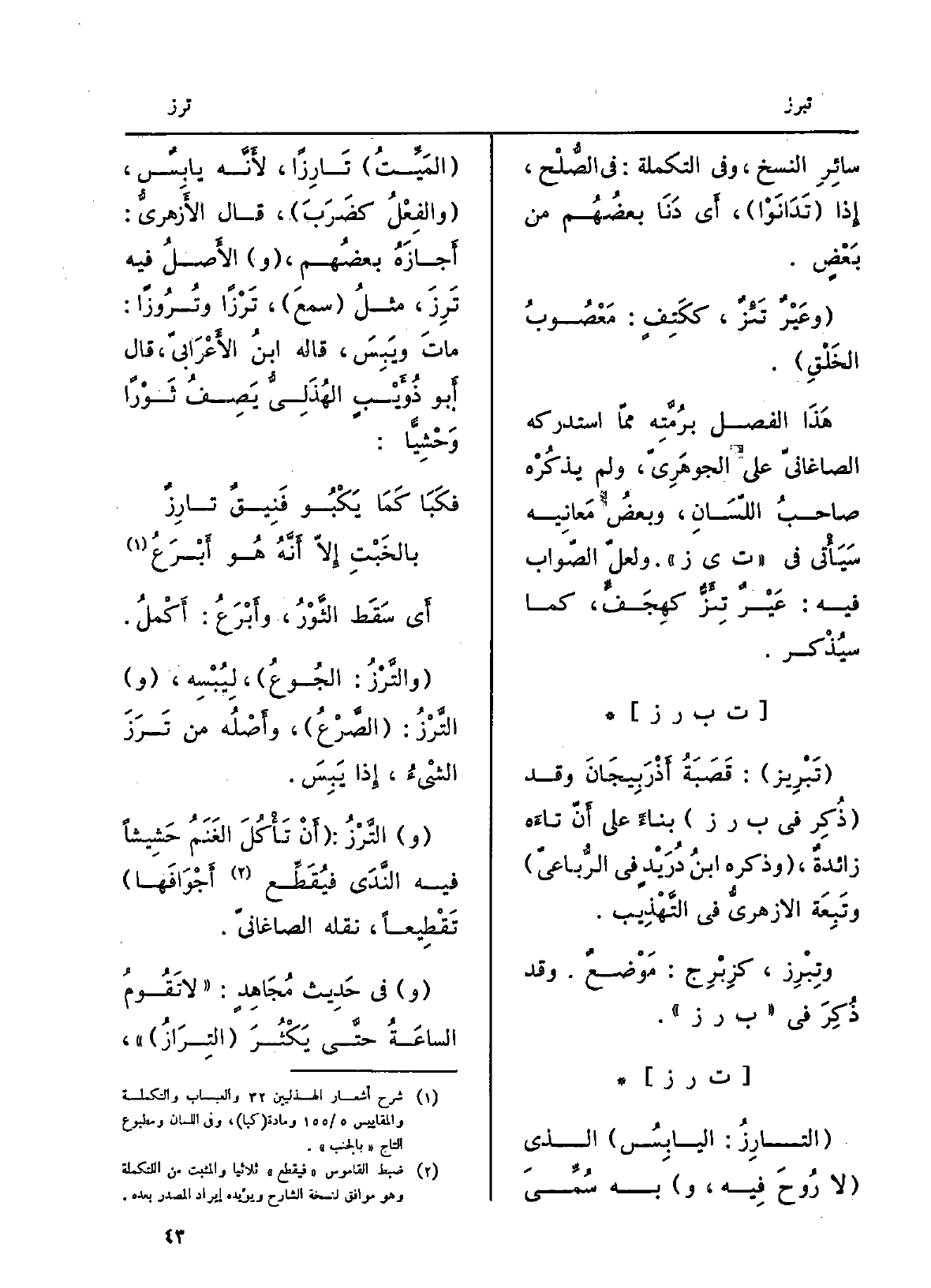 أَي سَقَطَ الثَّوْر، وأَبْرَعُ: أَكْمَلُ. والتَّرْز: الْجُوع، ليُبْسِه، التَّرْز: الصَّرْع، وأصلُه من تَرَزَ الشيءَ، إِذا يَبِسَ. التَّرْز: أَن تَأْكُلَ الغنَمُ حَشيشاً فِيهِ النّدى فيُقَطِّع أَجْوَافَها تَقْطِيعاً، نَقله الصَّاغانِيّ. فِي حَدِيث مُجاهِد: لَا تقومُ الساعةُ حَتَّى يَكْثُرَ التِّرازُ،