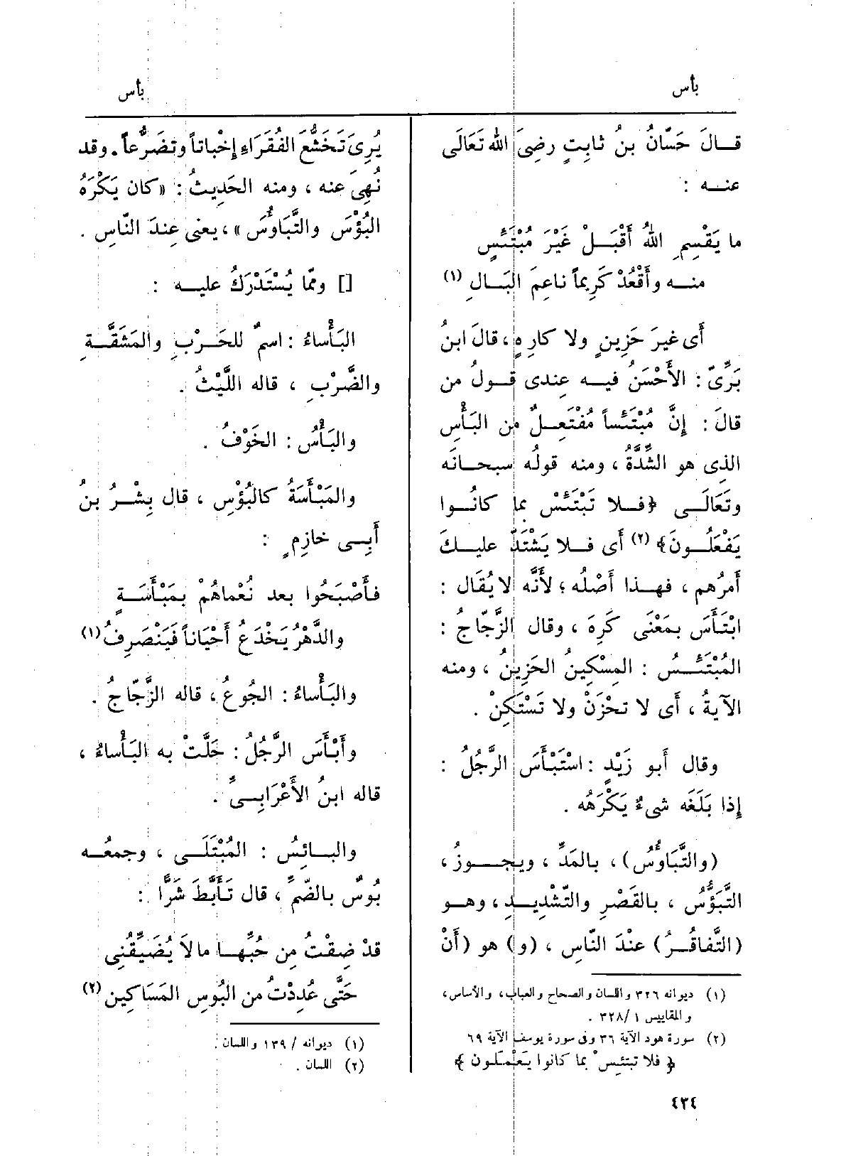 أَي غيرَ حزينٍ وَلَا كارِهٍ، قَالَ ابنُ برِّي: الأَحسنُ فِيهِ عِنْدِي قولُ من قَالَ: إنّ} مُبْتَئِساً مُفْتَعِلٌ من {البَأْسِ الَّذِي هُوَ الشّدَّة، وَمِنْه قولُه سبحانَه وَتَعَالَى: فَلَا} تَبْتَئِسْ بِمَا كَانُوا يَفْعَلون أَي فَلَا يَشْتَدَّ عليكَ أمرُهم، فَهَذَا أصلُه لأنّه لَا يُقَال: {ابْتَأَسَ بِمَعْنى كَرِهَ، وَقَالَ الزّجَّاج:} المُبْتَئِسُ: المِسكينُ الحزين، وَمِنْه الآيةُ، أَي لَا تَحْزَنْ وَلَا تَسْتَكِنْ. وَقَالَ أَبُو زَيْد: {اسْتَبْأَسَ الرجلُ: إِذا بَلَغَه شيءٌ يَكْرَهه.} والتَّباؤُس، بالمَدِّ، ويجوزُ {التَّبَؤُّس، بالقَصْرِ وَالتَّشْدِيد، وَهُوَ التَّفاقُر عندَ النَّاس، هُوَ أَن يُرِيَ تَخَشُّعَ الفقراءِ إخْباتاً وتَضرُّعاً، وَقد نُهِيَ عَنهُ، وَمِنْه الحَدِيث: كَانَ يَكْرَهُ} البُؤْسَ {والتَّباؤُسَ، يَعْنِي عندَ النَّاس. ومِمّا يُسْتَدْرَك عَلَيْهِ:} البَأْساء: اسمٌ للحربِ والمَشَقَّةِ وَالضَّرْب، قَالَه اللَّيْث. {والبَأْس: الْخَوْف.} والمَبْأَسَة {كالبُؤْس، قَالَ بِشْرُ بنُ أبي خازِمٍ: